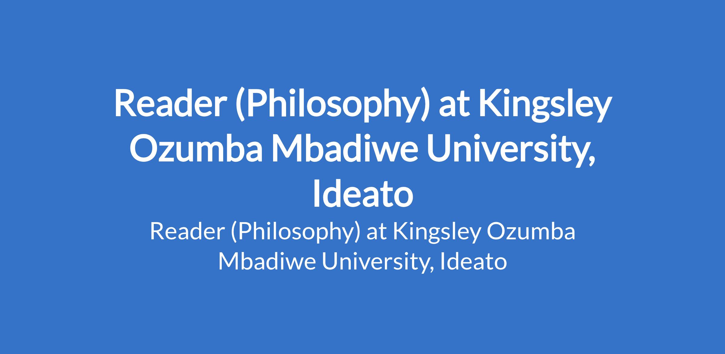 Kingsley Ozumba Mbadiwe University, Ideato invites applications for the position of: Reader (Philosophy). The position is located in Imo State. Interested candidates should possess a Doctorate Degree in the relevant field plus a minimum of ten (10) years post qualification experience in teaching and research in a university.