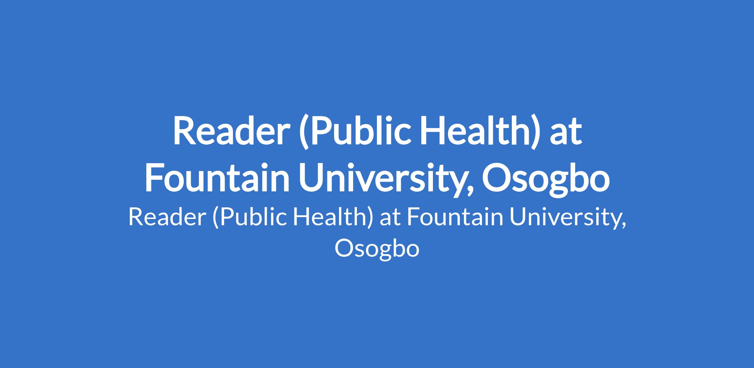 Fountain University, Osogbo invites applications from suitable candidates to fill the position of: Reader (Public Health). The position is located in Osun State. Interested candidates should possess a PhD Degree in a relevant discipline with at least six (6) years post-qualification experience in teaching and research in a university system.