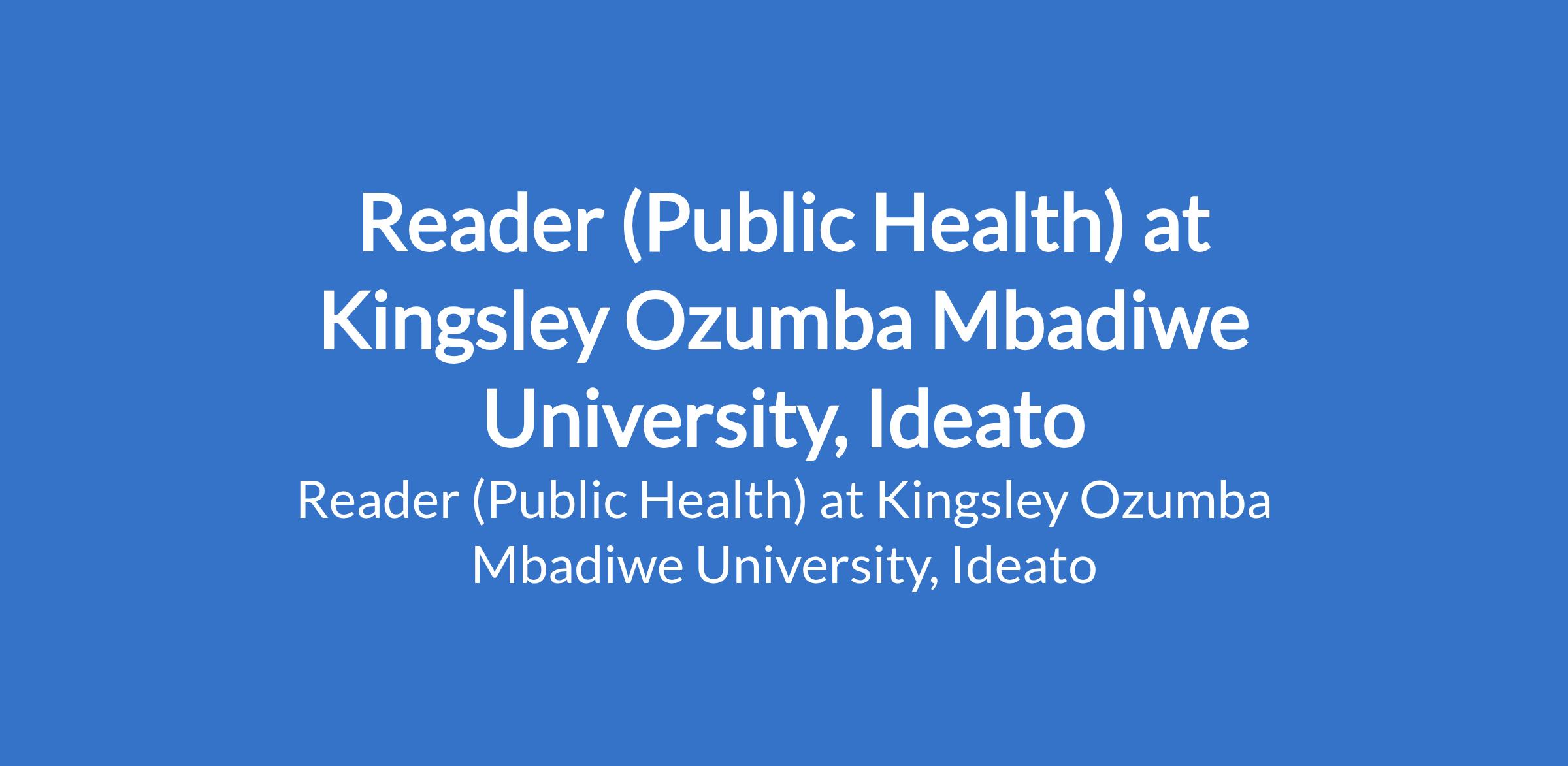 Kingsley Ozumba Mbadiwe University, Ideato invites applications for the position of: Reader (Public Health). The position is located in Imo State. Interested candidates should possess a Doctorate Degree in the relevant field with a minimum of ten (10) years post qualification experience in teaching and research in a university.