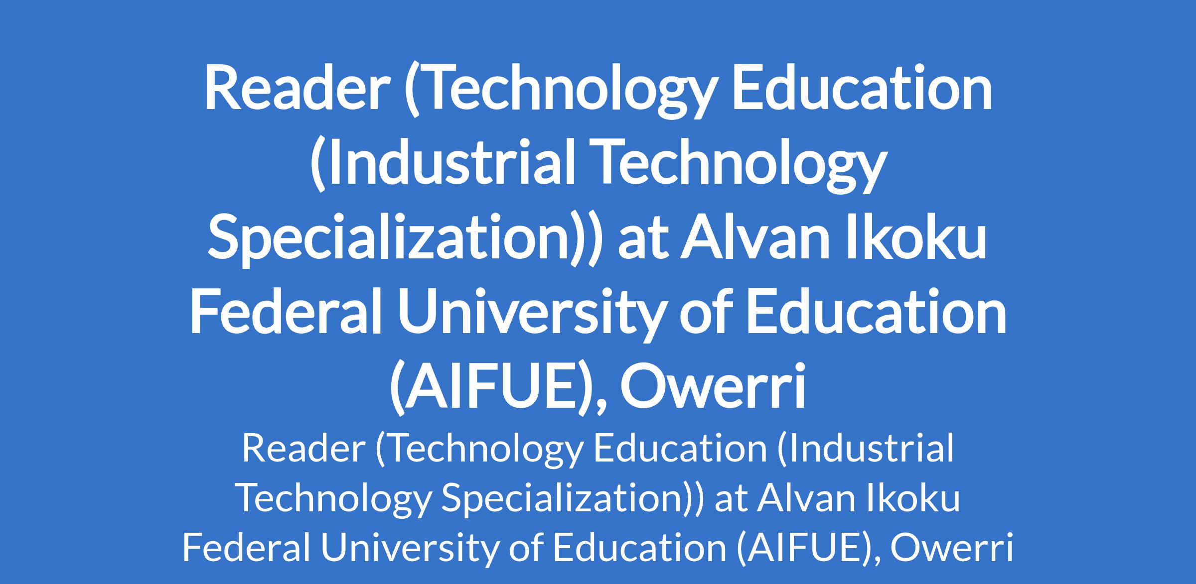 Alvan Ikoku Federal University of Education (AIFUE), Owerri invites applications from suitably qualified candidates for the position of: Reader (Technology Education (Industrial Technology Specialization)). The position is located in Imo State. Interested candidates should possess a PhD Degree with not less than twelve (12) years of university teaching/research experience and a minimum of three (3) years as Senior Lecturer.