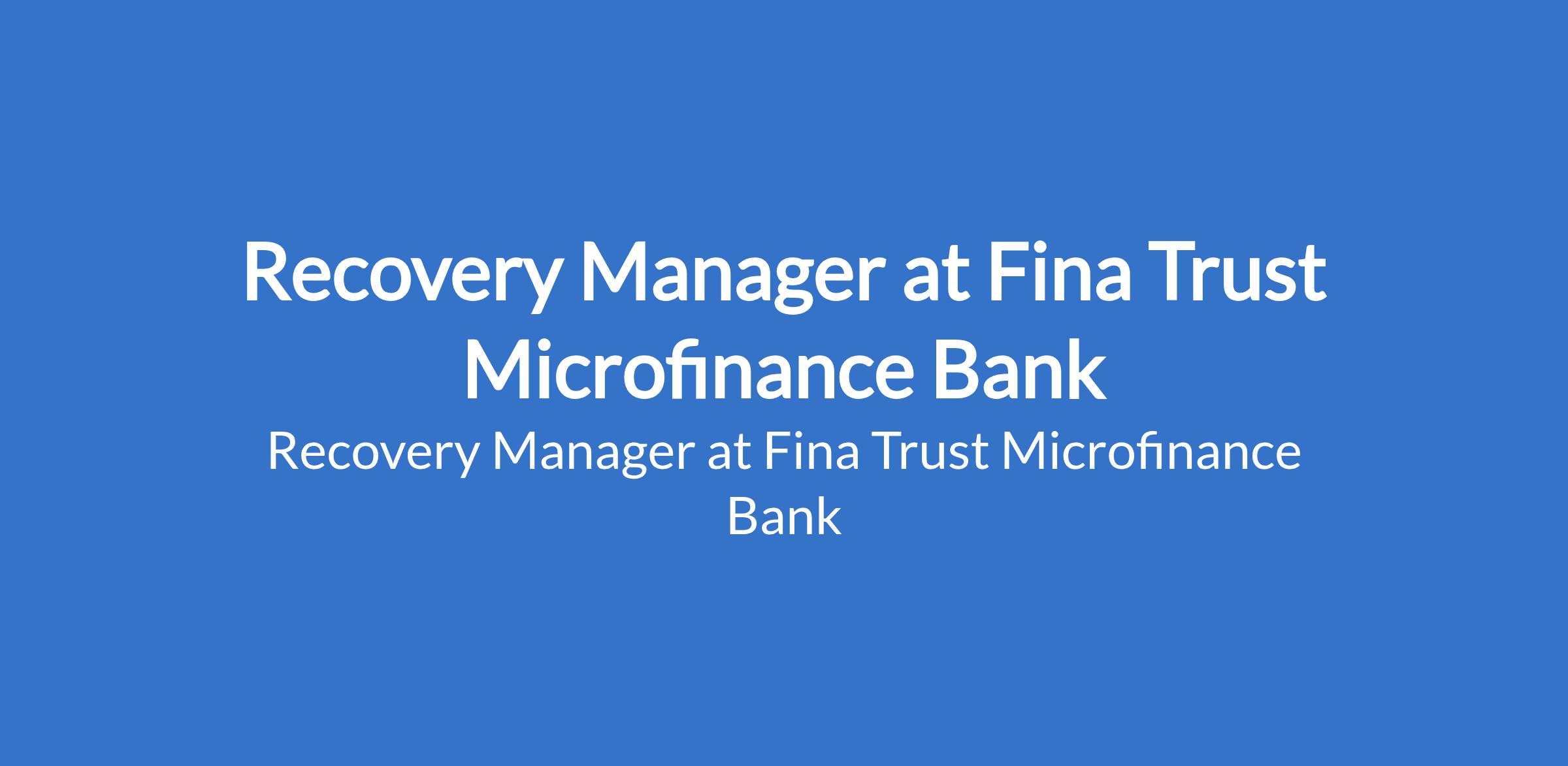 Fina Trust Microfinance Bank is recruiting to fill the position of: Recovery Manager. The position is located in Ikeja, Lagos State. Salary: N800,000 - N1,000,000 / month. Interested candidates should possess 7 - 10 years experience in credit / recovery (microfinance or banking) in Recovery.