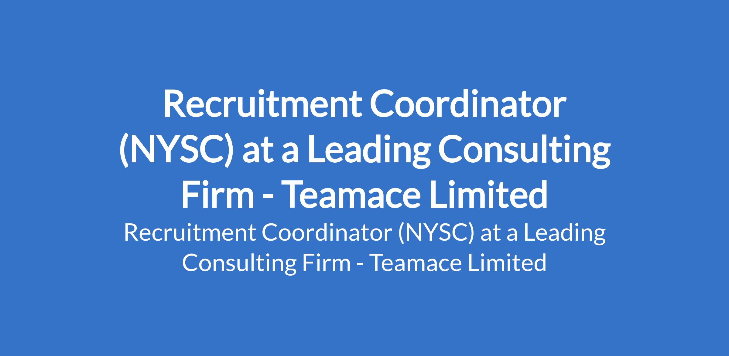 Teamace Limited - Our client, a leading consulting firm is recruiting to fill the position of: Recruitment Coordinator (NYSC). The position is located in Victoria Island, Lagos State. Salary: N100,000 monthly. Interested candidates should possess a Bachelors Degree in any discipline and must be a current NYSC corps member.