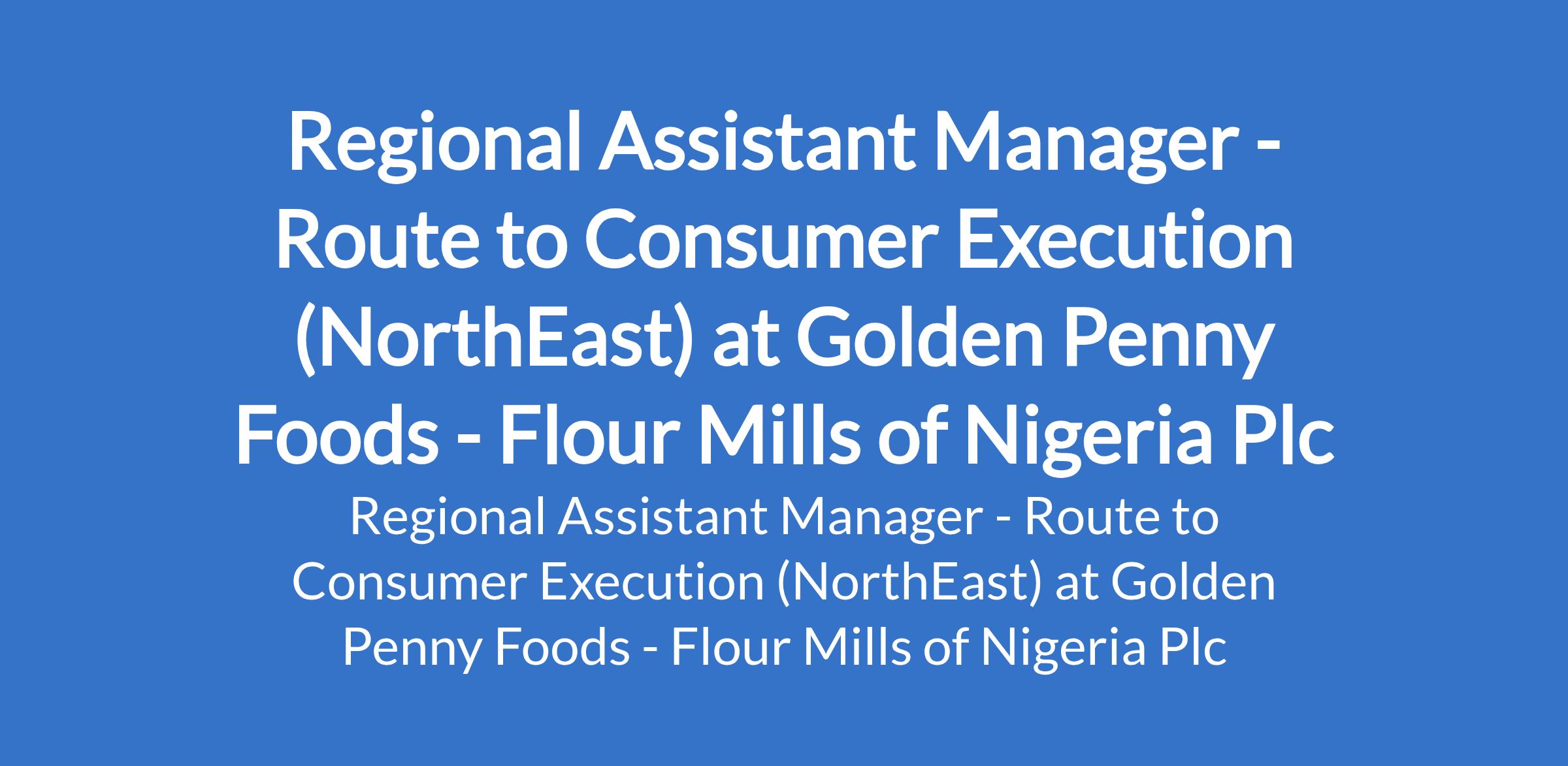 Golden Penny Foods, a subsidiary of Flour Mills of Nigeria Plc is recruiting to fill the position of: Regional Assistant Manager - Route to Consumer Execution. The position is located in NorthEast, Nigeria. Interested candidates should possess an HND / Bachelor's Degree in Business Administration, Marketing, Supply Chain, or a related field with 5 - 8 years of experience in route-to-market execution, distribution management, or sales operations, preferably in FMCG or food manufacturing.