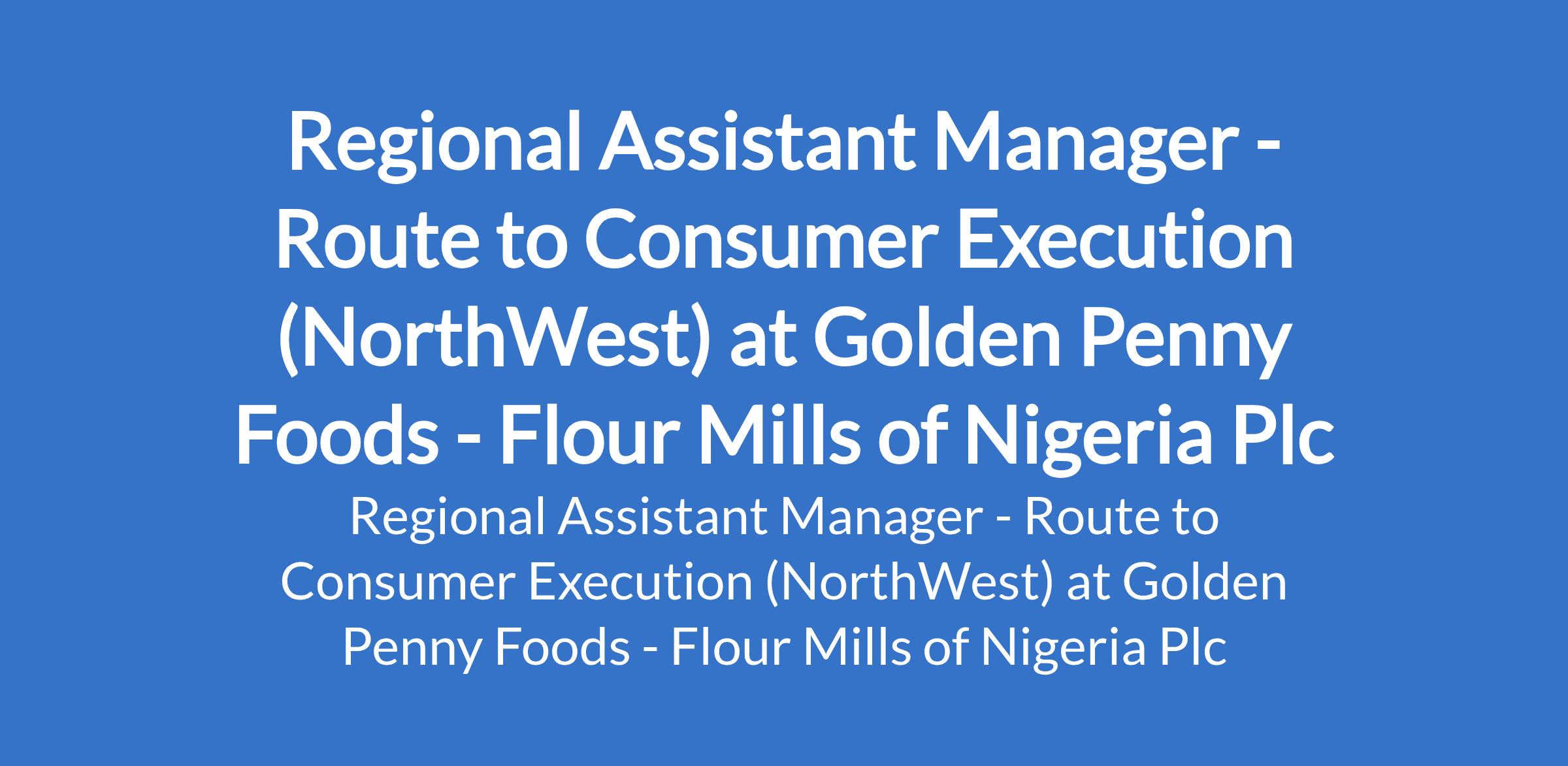 Golden Penny Foods, a subsidiary of Flour Mills of Nigeria Plc is recruiting to fill the position of: Regional Assistant Manager - Route to Consumer Execution. The position is located in the Northwestern region of Nigeria. Interested candidates should possess an HND / Bachelor's Degree in Business Administration, Marketing, Supply Chain, or a related field with 5 - 8 years of experience in route-to-market execution, distribution management, or sales operations, preferably in FMCG or food manufacturing.