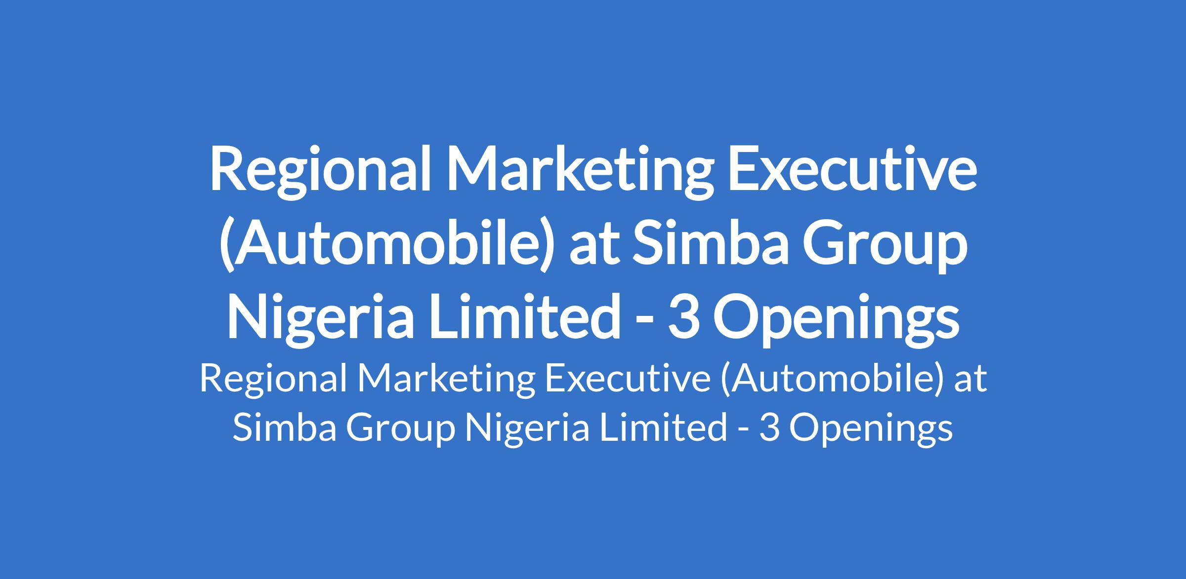 Simba Group Nigeria Limited is recruiting to fill the position of: Regional Marketing Executive (Automobile). The position is located in Abuja (FCT), Enugu & Lagos States. Interested candidates should possess a Bachelors Degree in Marketing, Business Administration, or a related field with 35 years experience in marketing, brand management, or field marketing. Experience in the automobile or FMCG sector is a strong advantage.