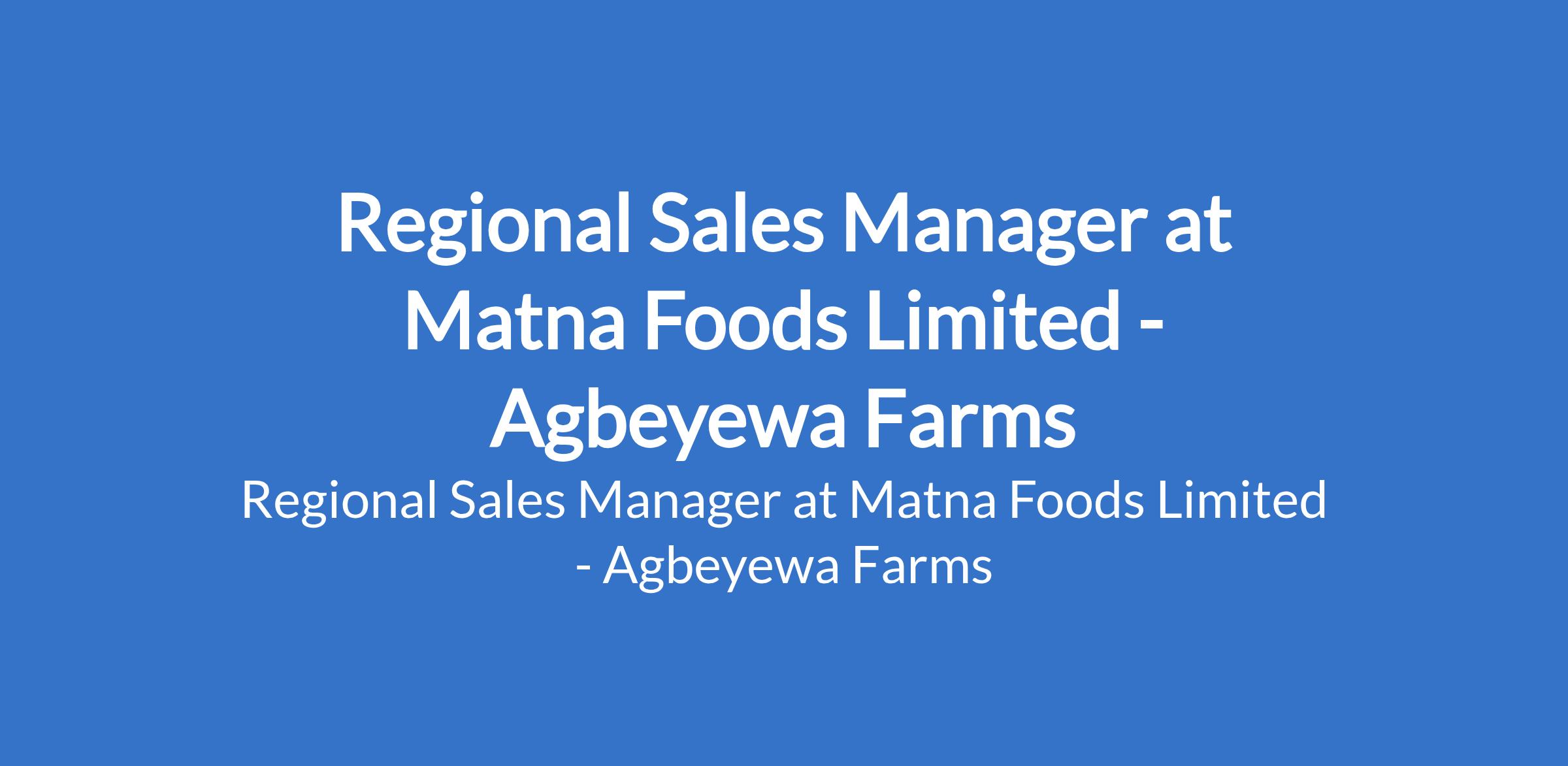 Agbeyewa Farms - Our client, Matna Foods Limited, is recruiting to fill the position of: Regional Sales Manager. The position is located in Ogbese, Ondo State. Interested candidates should possess a Bachelors Degree in Business, Marketing, Economics, Agribusiness, or related field with 812 years of sales experience within FMCG, food processing, agro-processing, or industrial manufacturing.