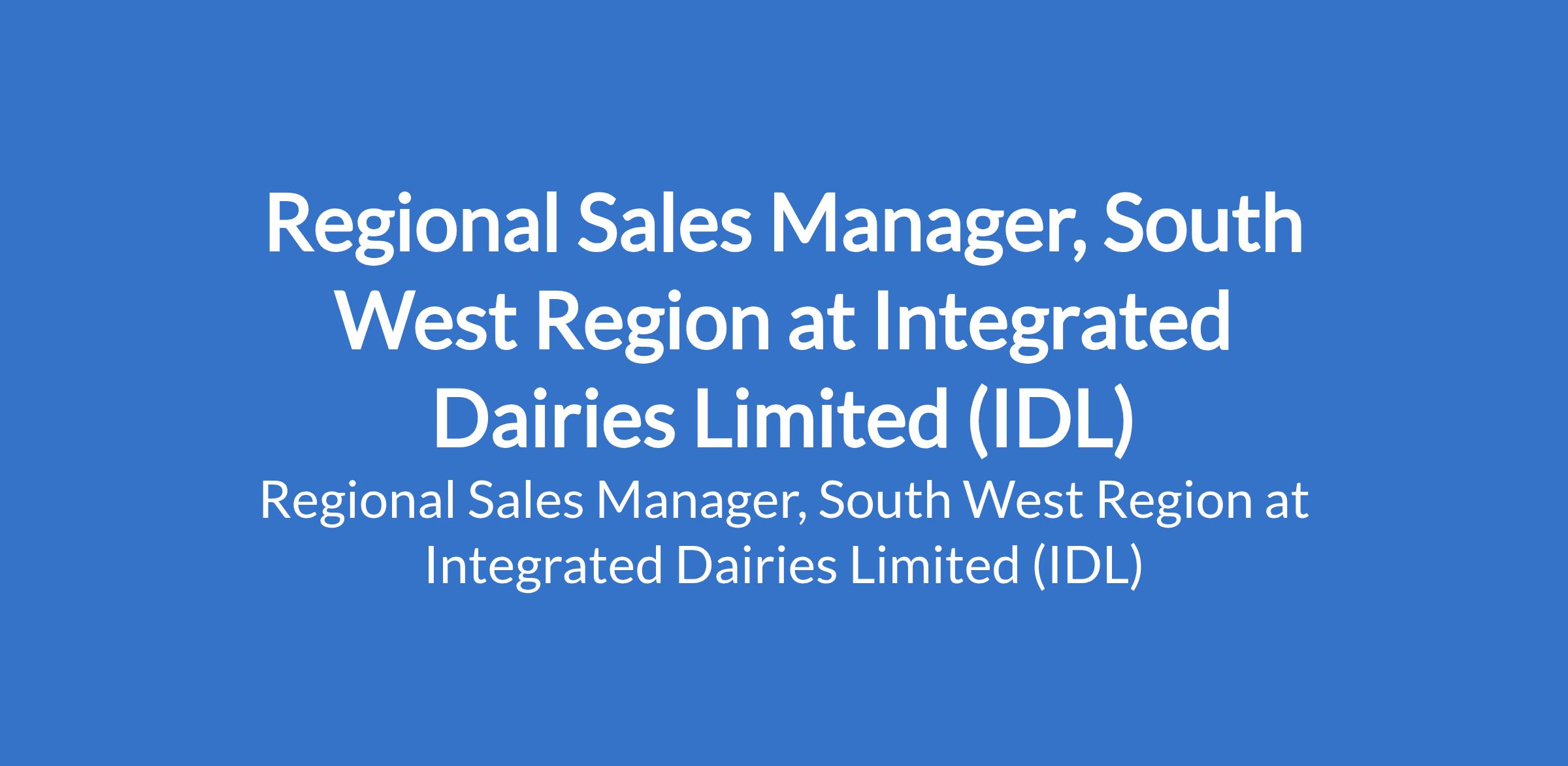 Integrated Dairies Limited (IDL) is recruiting to fill the position of: Regional Sales Manager, South West Region. Interested candidates should possess relevant qualifications and experience.