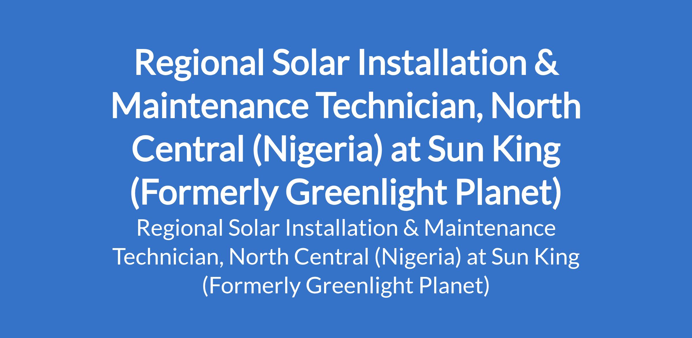 Sun King (Formerly Greenlight Planet) is recruiting to fill the position of: Regional Solar Installation & Maintenance Technician, North Central (Nigeria). The position is located in Kaduna State. Interested candidates should possess a Degree in Engineering or another relevant discipline with 4+ years of experience in after-sales service delivery and technical assistance within the electronic consumer goods, solar inverter systems, or mobile device industry.