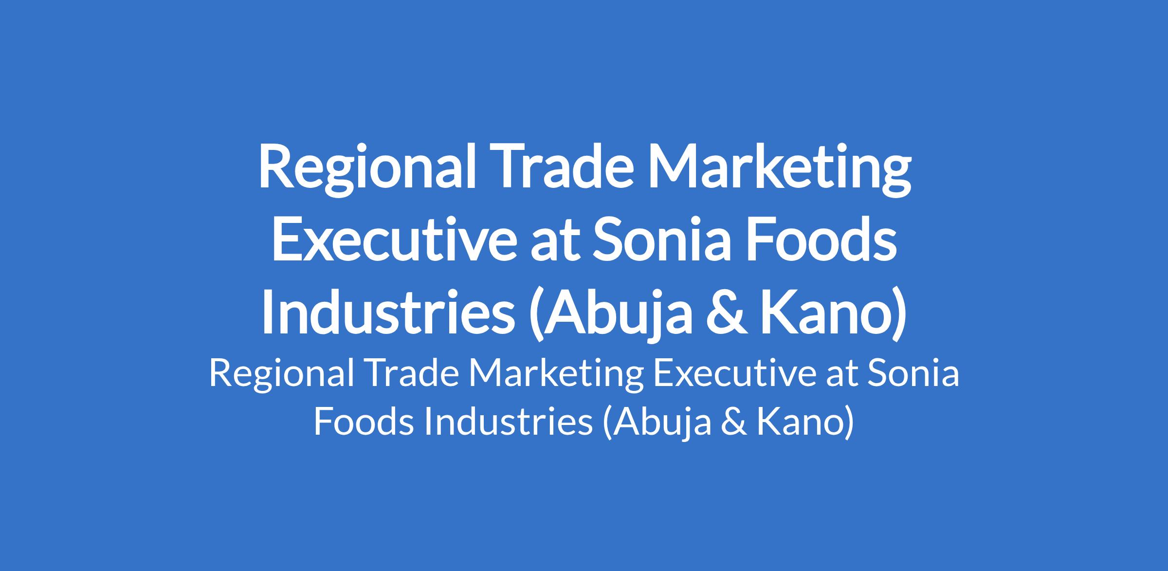 Sonia Foods Industries is recruiting to fill the position of: Regional Trade Marketing Executive. The position is located in Abuja (FCT) and Kano State. Salary: N250,000 - N350,000 monthly. Interested candidates should possess a Bachelors Degree in Marketing, Business Administration, or related field 25 years experience in Trade Marketing, Sales, or related role.