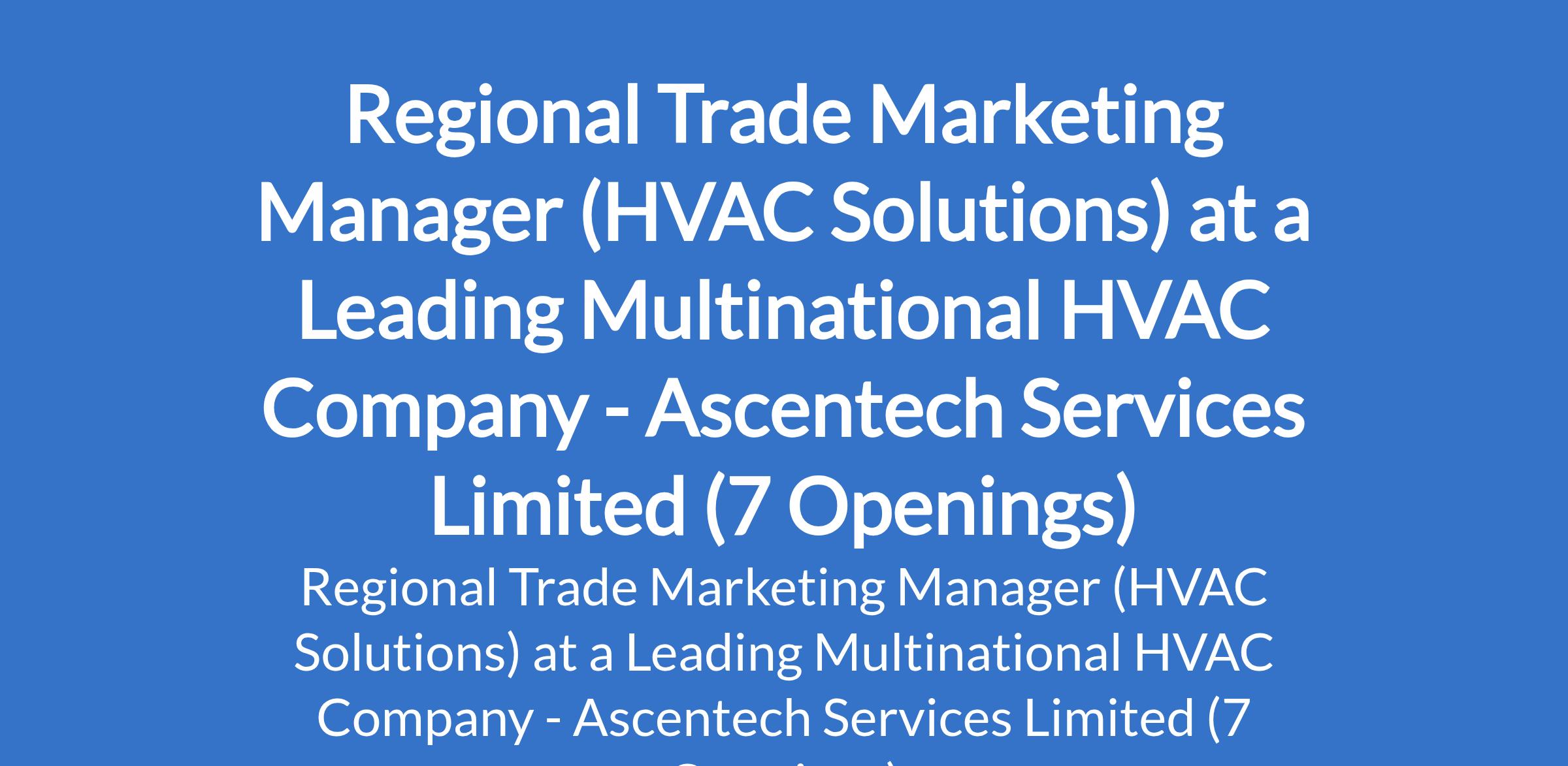 Ascentech Services Limited - Our client, a leading Multinational HVAC company is recruiting to fill the position of: Regional Trade Marketing Manager (HVAC Solutions). The position is located in Abuja (FCT), Benue, Kogi, Kwara, Nasarawa, Niger, & Plateau States. Salary: N500,000 - N1,000,000 / month. Interested candidates should possess relevant qualifications with a minimum of 3 years experience in channel sales, trade marketing, or dealer development.