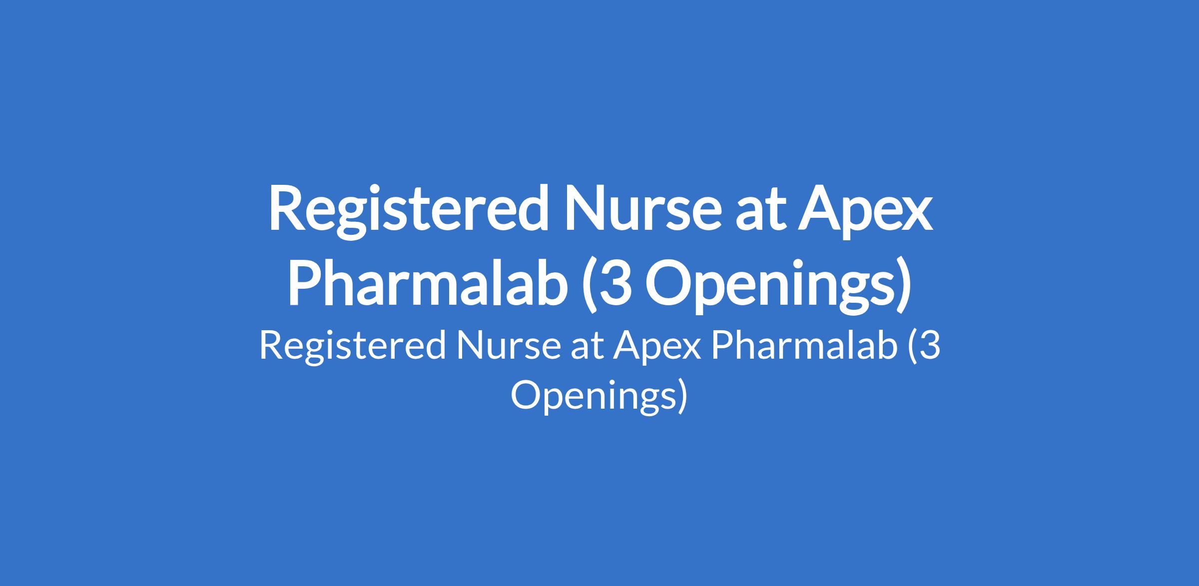 Apex Pharmalab is recruiting to fill the position of: Registered Nurse. The position is located in Akowonjo, Ojodu Berger, and Yaba - Lagos State. Interested candidates should be a Registered Nurse (RN) with current license with 12 years experience in clinical, community, or public health nursing.