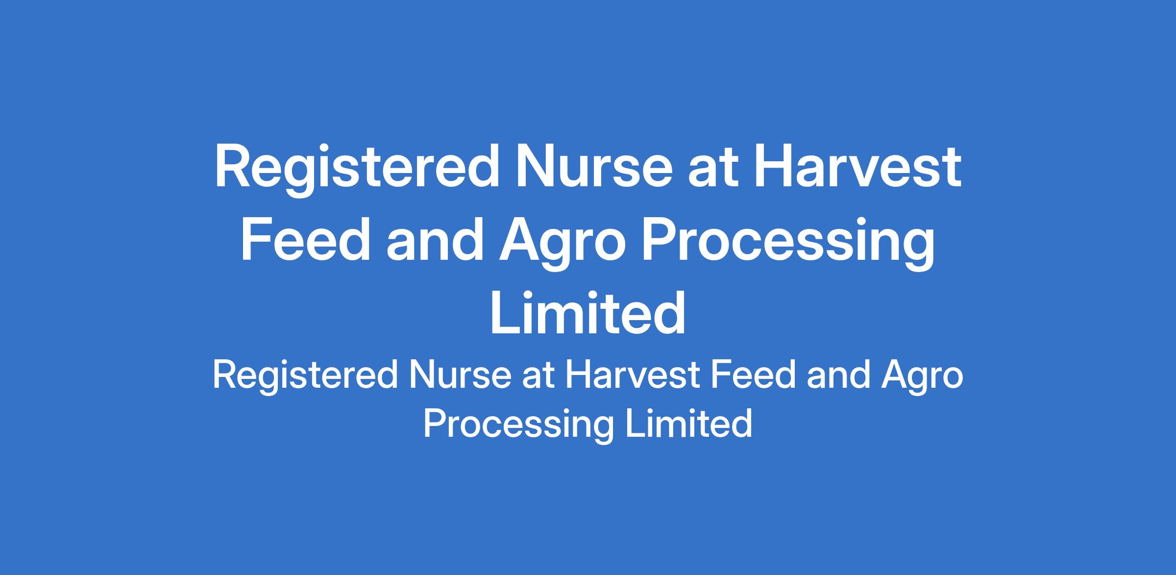 Harvest Feed and Agro Processing Limited is recruiting to fill the position of: Registered Nurse. The position is located in Ogun State. Interested candidates must be a Registered Nurse (RN) with a valid practicing license with 35 years experience in an industrial, manufacturing, or factory setting.