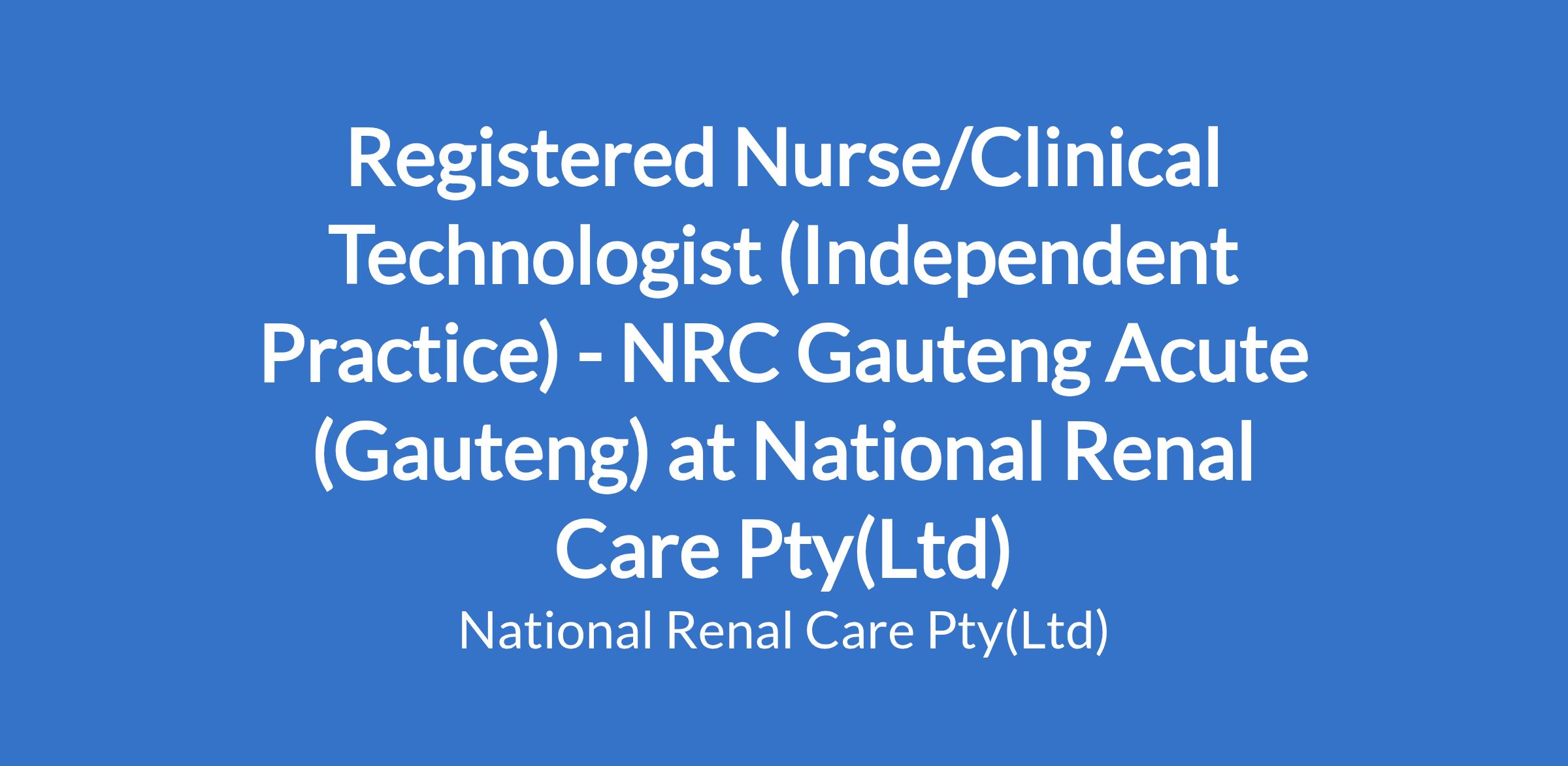 Registered Nurse/Clinical Technologist (Independent Practice) - NRC Gauteng Acute (Gauteng) at National Renal Care Pty(Ltd)