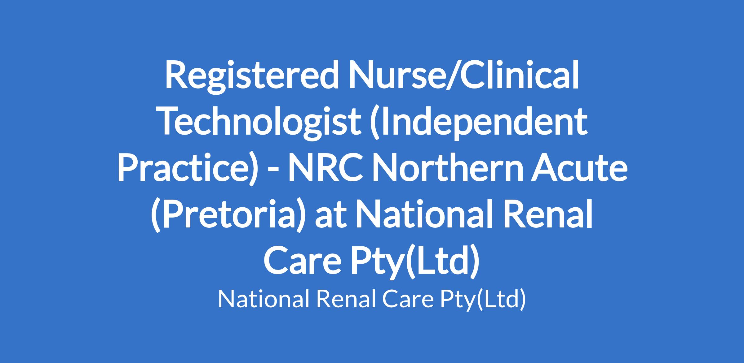 Registered Nurse/Clinical Technologist (Independent Practice) - NRC Northern Acute (Pretoria) at National Renal Care Pty(Ltd)