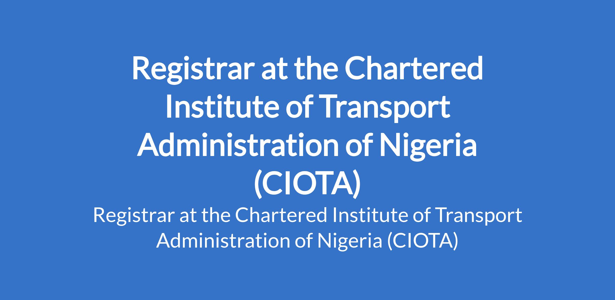 The Chartered Institute of Transport Administration of Nigeria (CIOTA) invites applications from suitable candidates to fill the position of: Registrar. Interested candidate should possess minimum of a Bachelors Degree in Transport Management, Logistics, Social Sciences, Public Administration, Law or related discipline from a recognized institution (a Masters Degree will be preferred), be a registered and financial member of CIoTA at Full member or Fellow category, with not less than 15 years post-qualification experience, and at least 5 years in senior management or leadership position (leading in the sector will be an additional advantage).