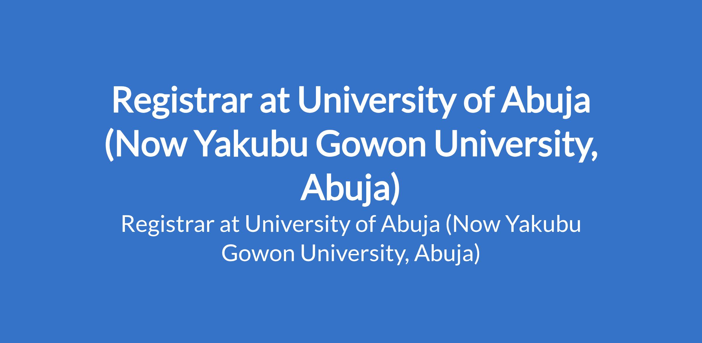 University of Abuja (Now Yakubu Gowon University, Abuja) invites applications for the position of: Registrar. Interested candidates should possess a good honours Degree from a recognized University and must have 20 years post-graduation experience with at least 15 years in the university system, and must have been a Deputy Registrar for a minimum of five (5) years.