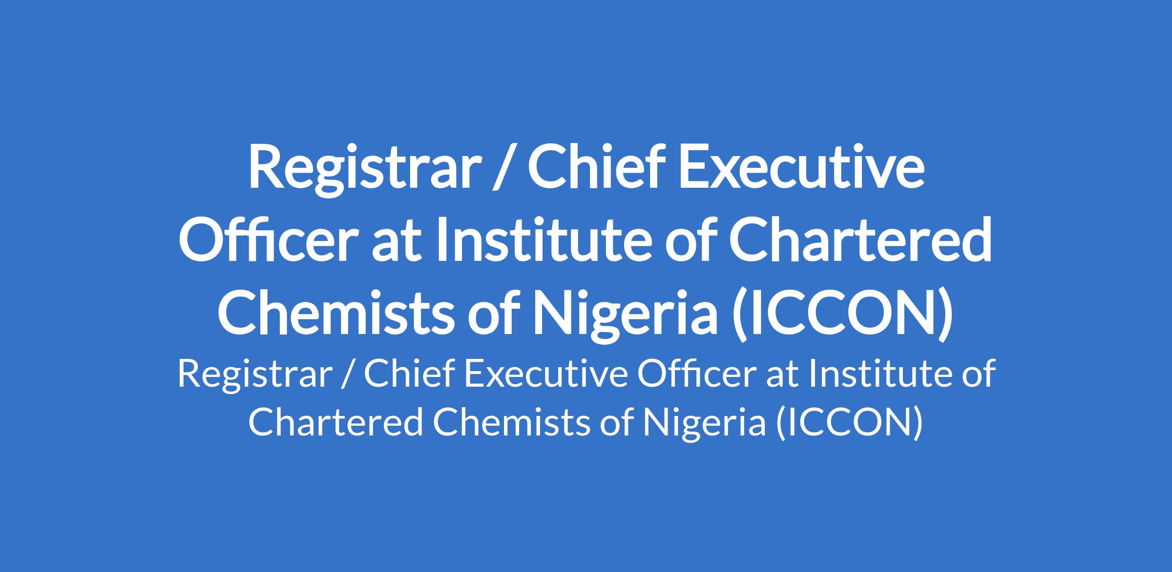 Institute of Chartered Chemists of Nigeria (ICCON) is recruiting to fill the position of: Registrar / Chief Executive Officer. The position is located in Abuja. Interested candidates should possess a good First Degree in Chemistry with a minimum of Second-Class Lower Division from a recognized Institution, and not less than twenty (20) years post-qualification cognate experience.