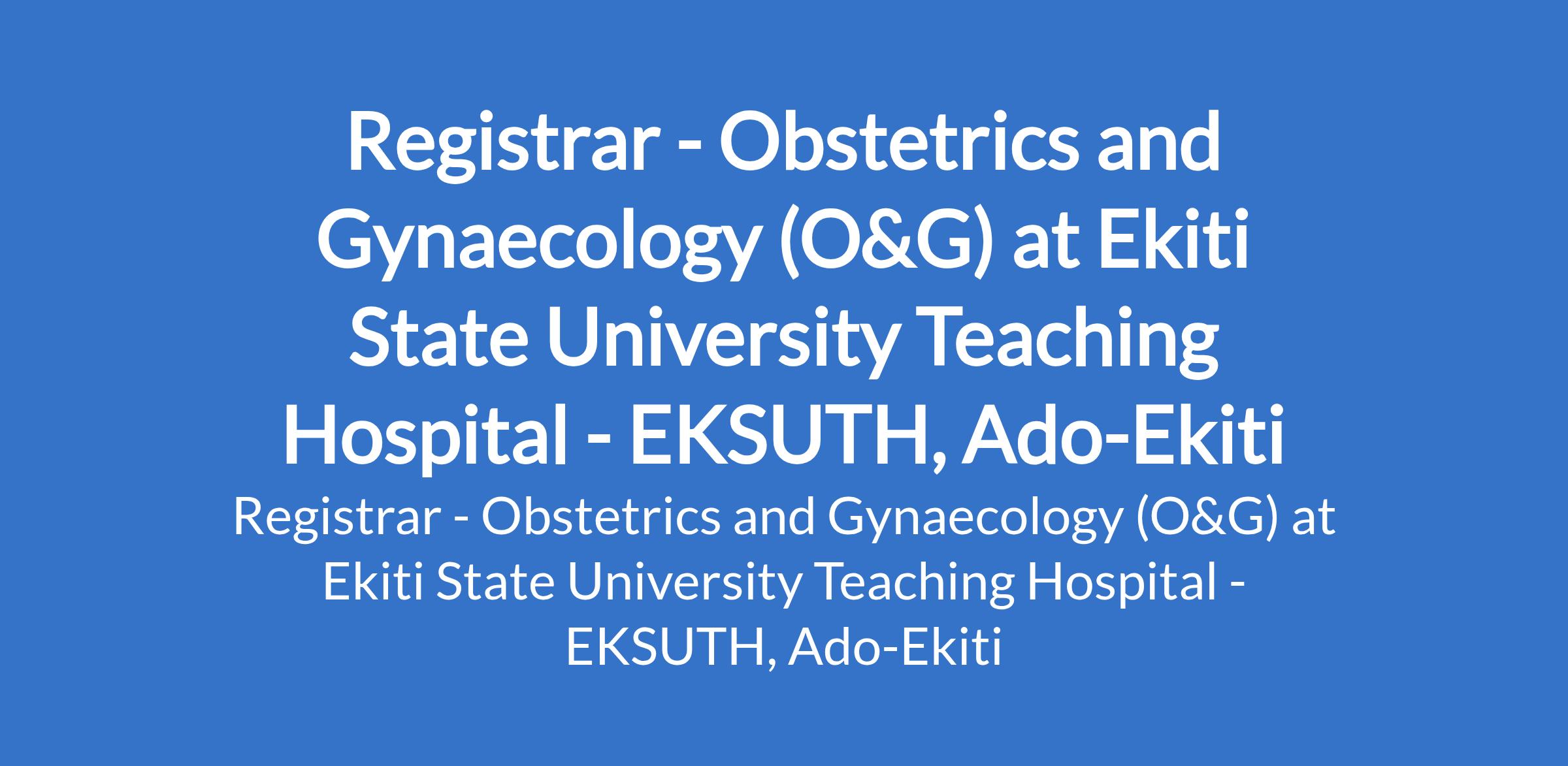 Ekiti State University Teaching Hospital (EKSUTH), Ado-Ekiti is recruiting to fill the position of: Registrar - Obstetrics and Gynaecology (O&G). The position is located in Ekiti State. Interested candidates should possess an MBBS / MBChB / BDS qualification.