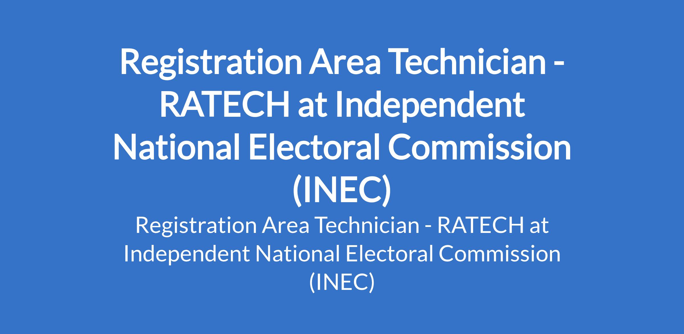 Independent National Electoral Commission (INEC) is recruiting to fill the position of: Registration Area Technician - RATECH (INEC Staff). The position is located in Abuja. Interested candidates should be a suitable INEC ICT staff (States & HQ) not engaged in any other election duities.