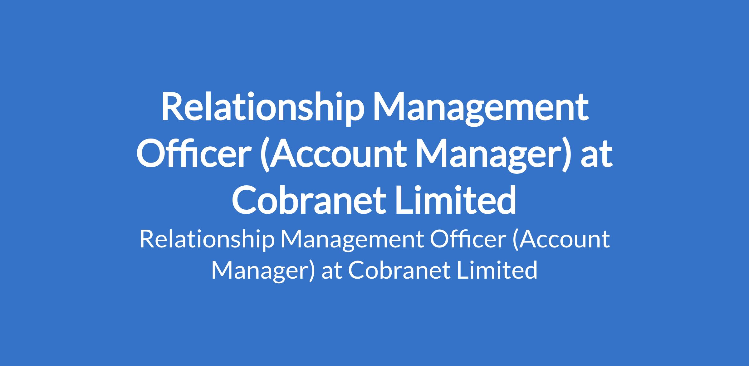 Cobranet Limited is recruiting to fill the position of: Relationship Management Officer. The position is located in Lagos State. Interested candidates should possess a BA/B.Sc Degree in Business Administration, Sales or relevant fields with proven work experience as an Account Manager, Key Account Manager, Sales Account Manager, Junior Account Manager or relevant role.