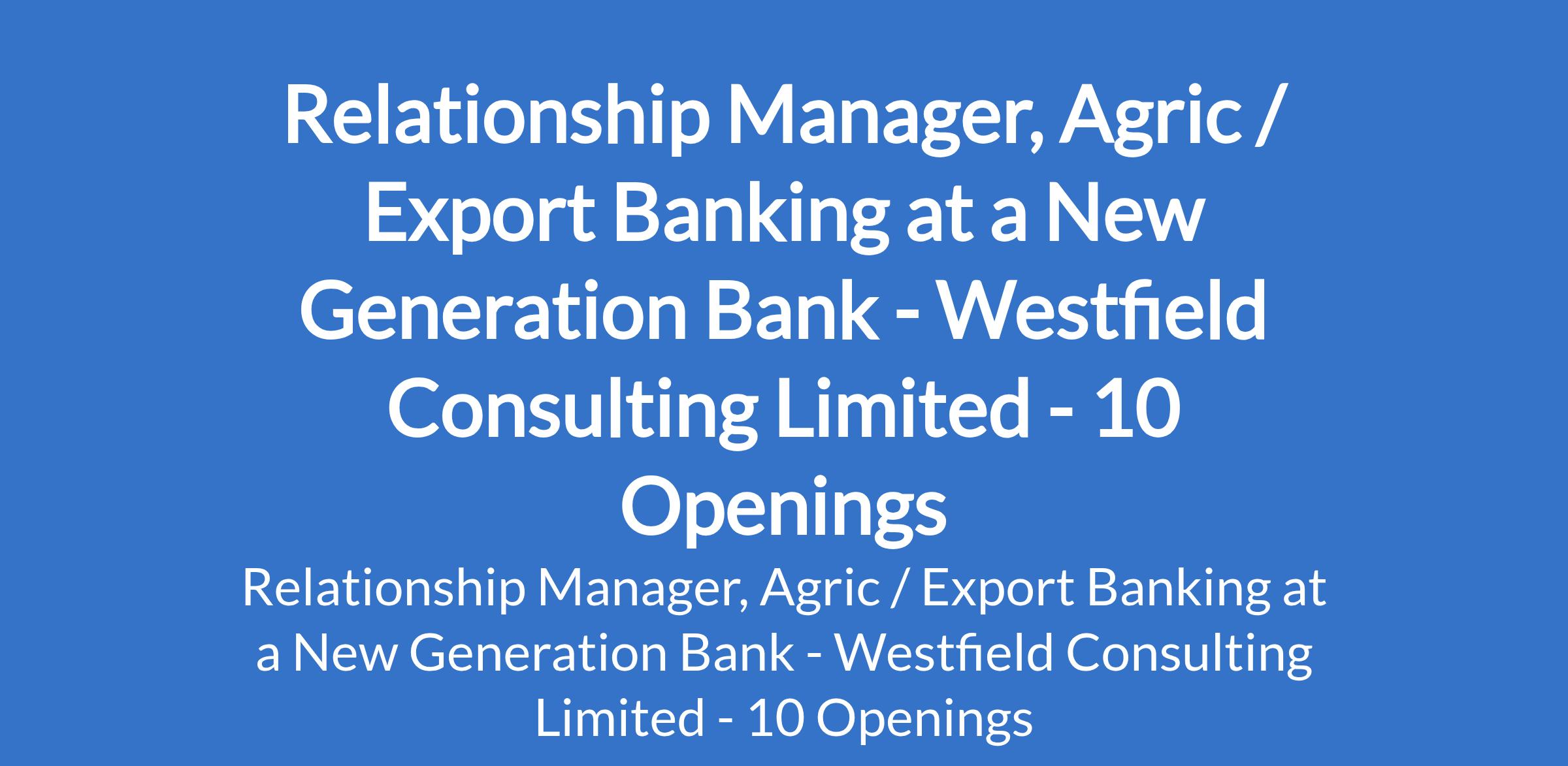 Westfield Consulting Limited - a New Generation Bank is recruiting to fill the position of: Relationship Manager, Agric / Export Banking. The position is located in Abuja (FCT) , Adamawa, Akwa Ibom , Cross River , Delta, Edo, Lagos, Ogun, Oyo, and Rivers States. Interested candidates should possess a Degree in Finance, Accounting, Economics, or related discipline in a recognised university with a minimum 4 years banking experience in sales and credit.