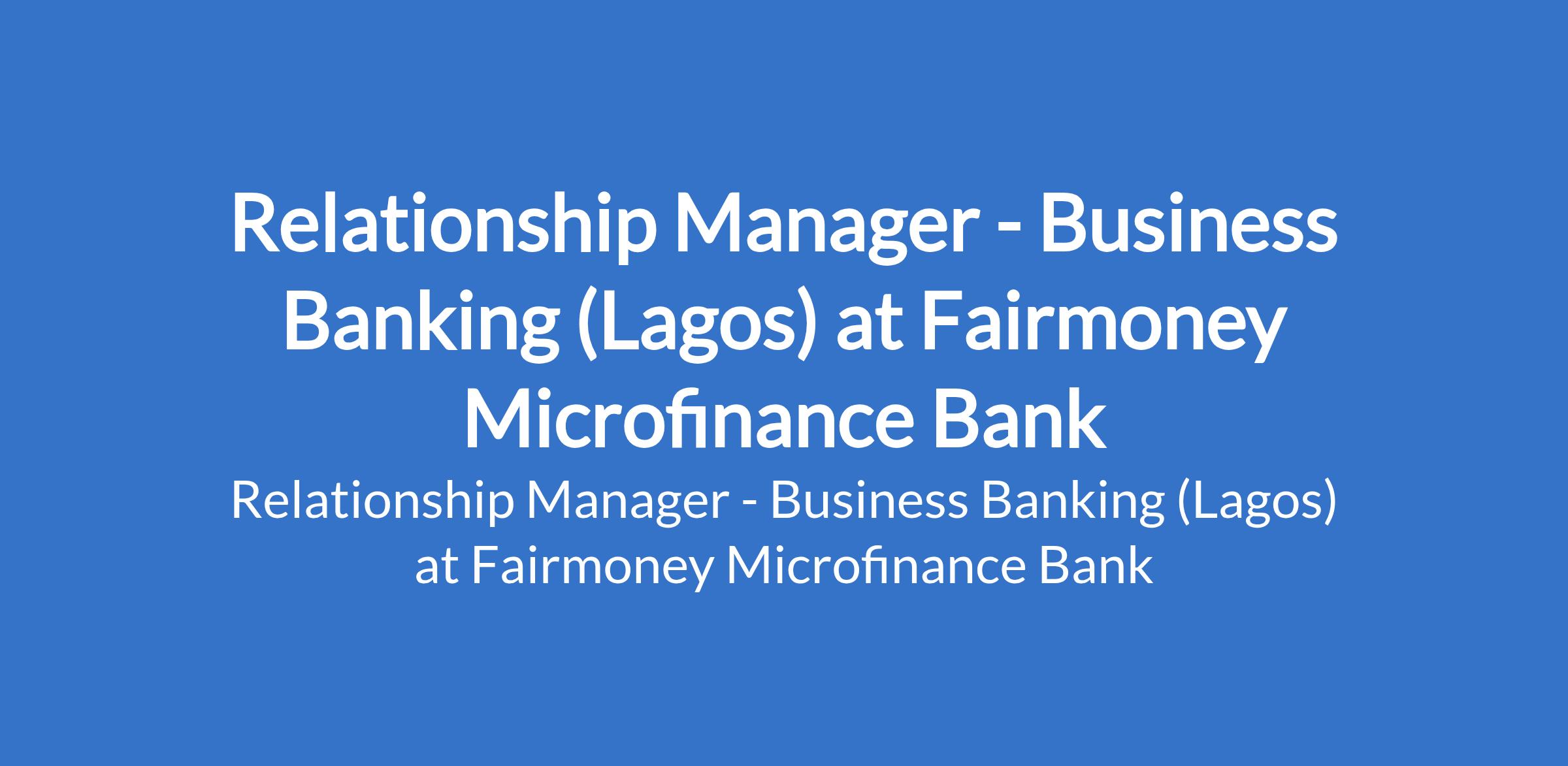 Fairmoney Microfinance Bank is recruiting to fill the position of: Relationship Manager - Business Banking. The position is located in Lagos State. Interested candidates should possess a Bachelor's Degree in Sales, Marketing, Finance, Business Administration, or a related discipline with 6 - 8 years of experience in merchant lending, SME lending, business banking, or fintech credit sales.