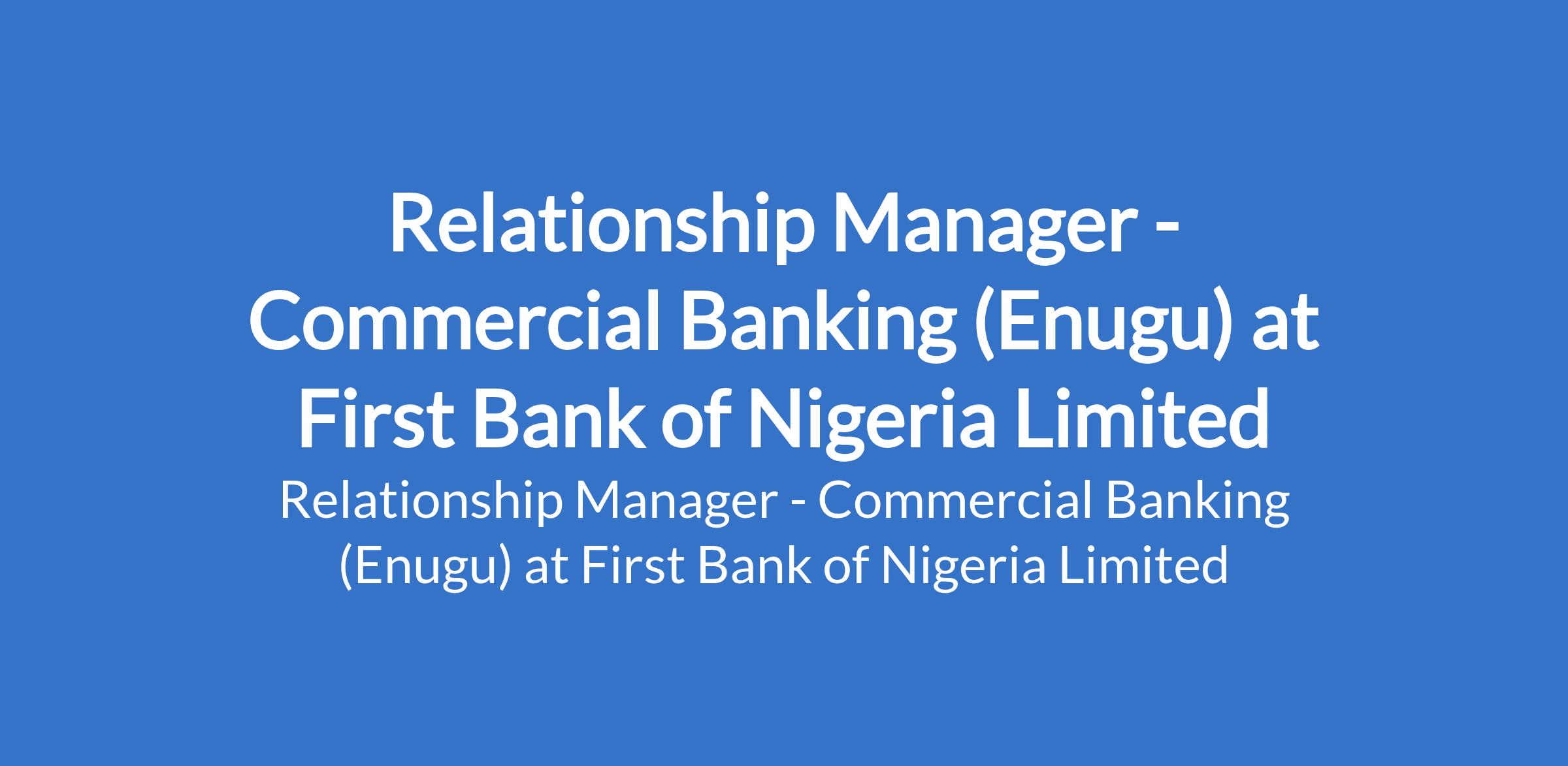 First Bank of Nigeria Limited is recruiting to fill the position of: Relationship Manager - Commercial Banking. The position is located in Enugu State. Interested candidates should possess a First Degree or its equivalent in any discipline preferably business-related with 3 years relevant banking (marketing and credit) experience.