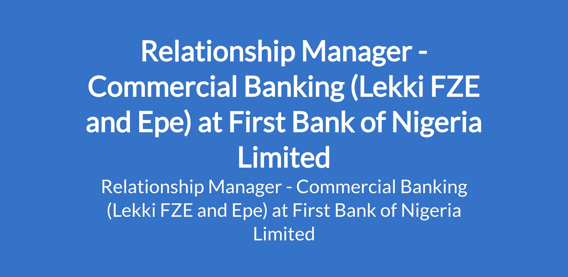 First Bank of Nigeria Limited is recruiting to fill the position of: Relationship Manager - Commercial Banking. The position is located in Lekki FZE and Epe - Lagos State. Interested candidates should possess a First Degree or its equivalent in any discipline preferably business-related with 3 years relevant banking (marketing and credit) experience.