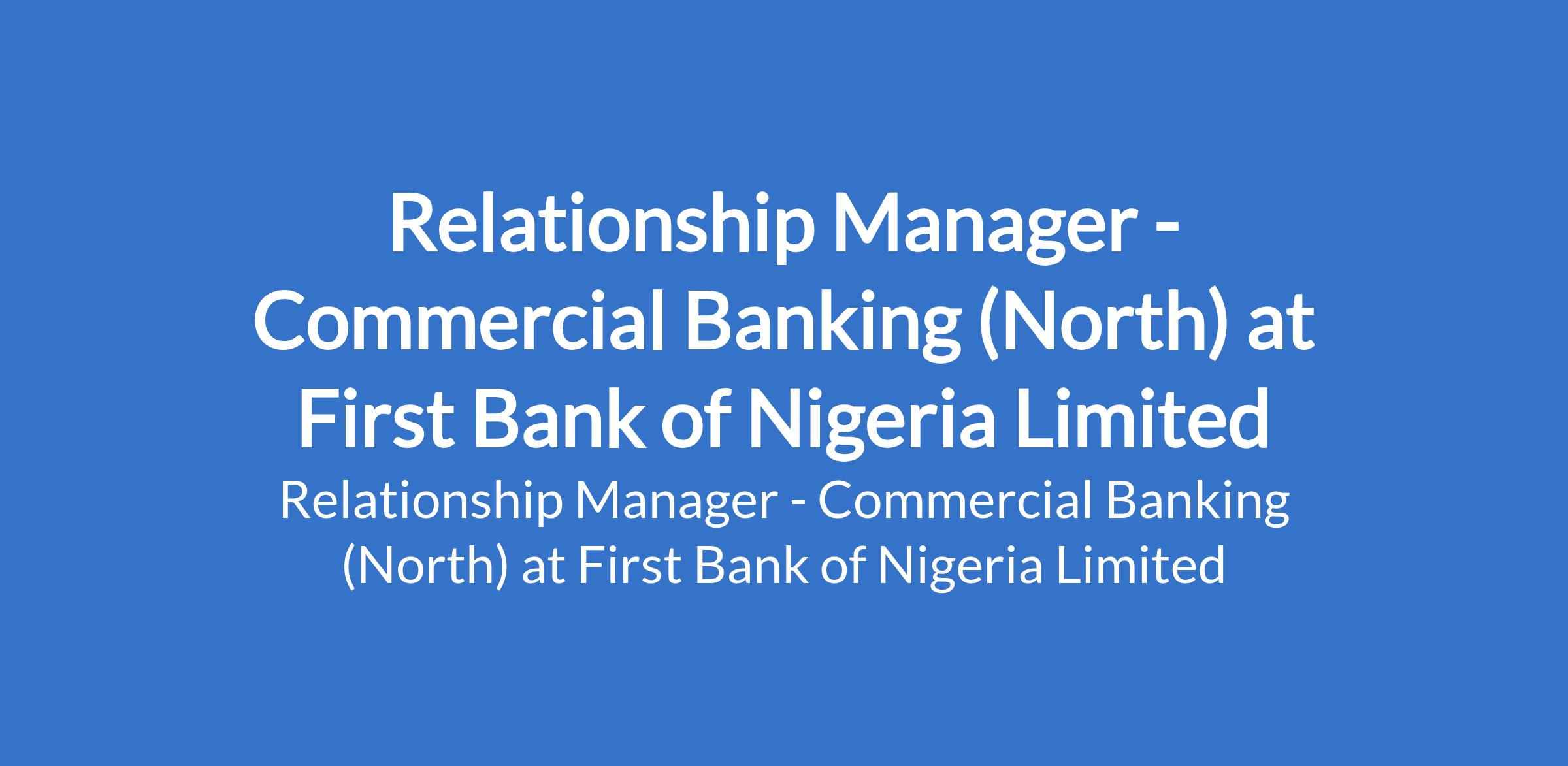 First Bank of Nigeria Limited is recruiting to fill the position of: Relationship Manager - Commercial Banking (North). The position is located in Kogi & Keffi - Nasarawa States. Interested candidates should possess a First Degree or its equivalent in any discipline preferably business-related with 3 years relevant banking (marketing and credit) experience.