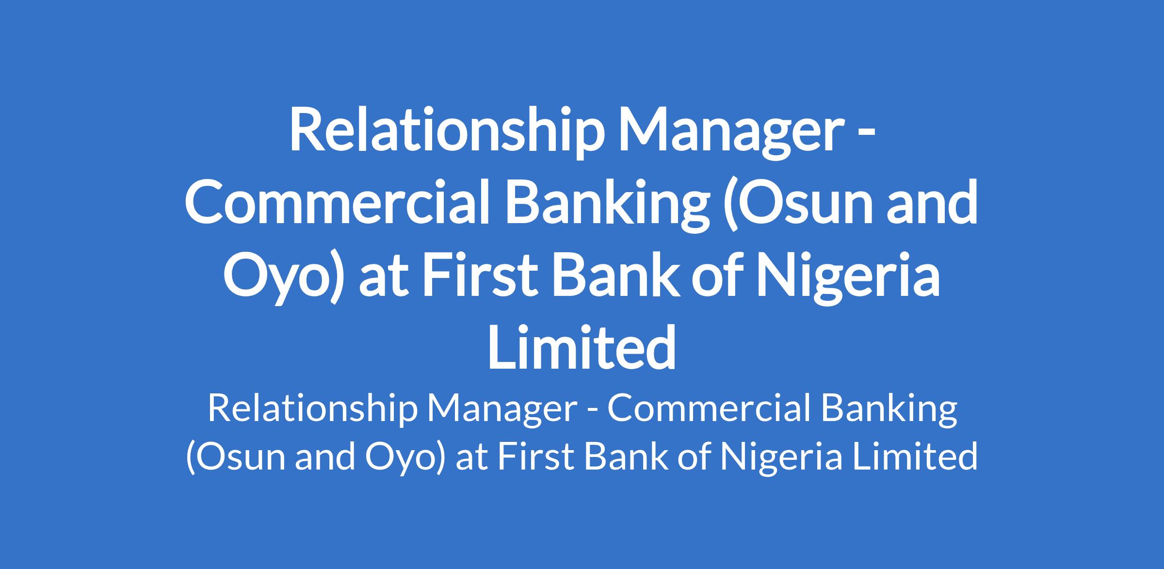 First Bank of Nigeria Limited is recruiting to fill the position of: Relationship Manager - Commercial Banking. The position is located in Ibadan Agodi - Oyo and Oshogbo - Osun States. Interested candidates should possess a First Degree or its equivalent in any discipline preferably business-related with 3 years relevant banking (marketing and credit) experience.