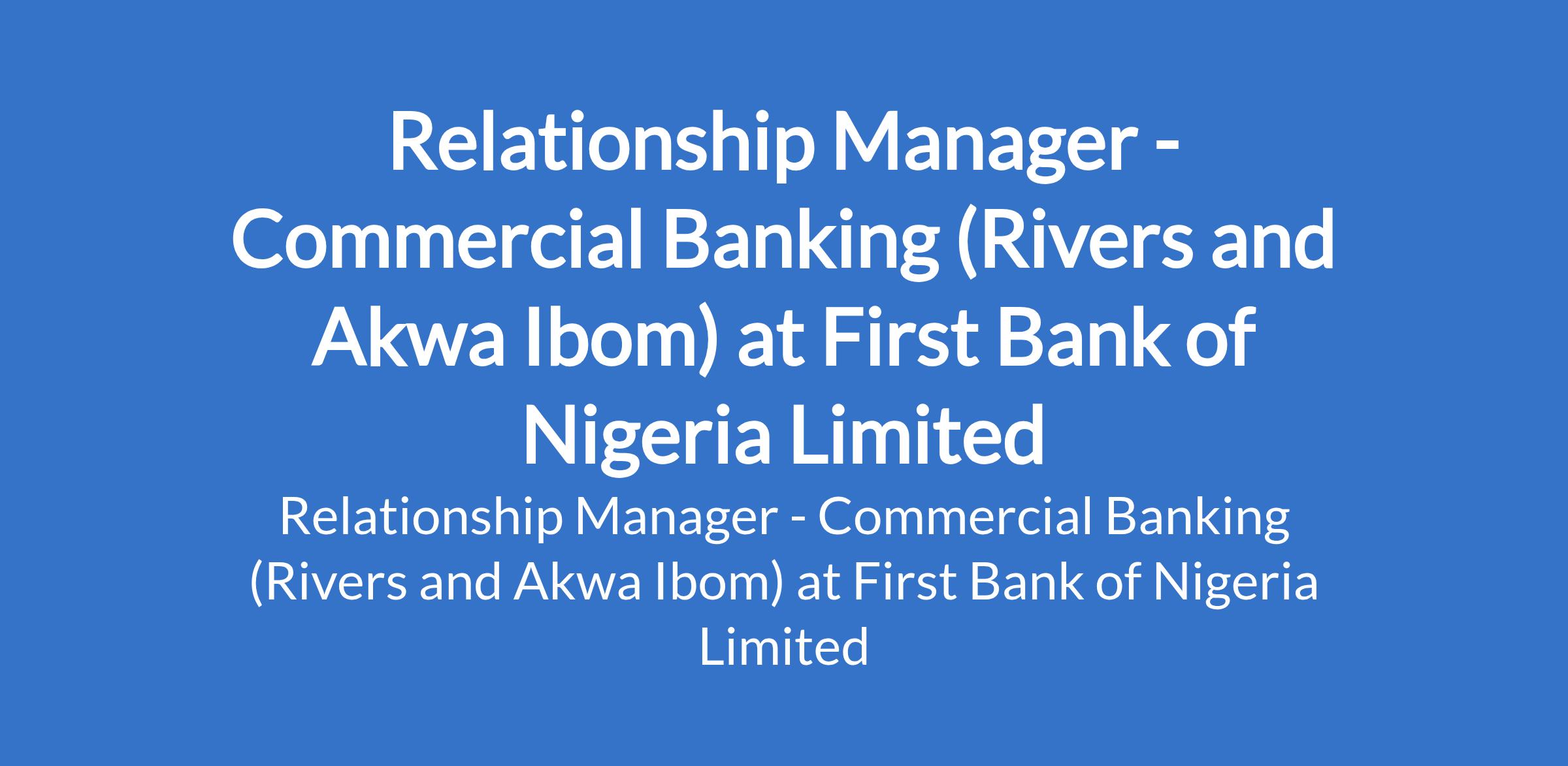 First Bank of Nigeria Limited is recruiting to fill the position of: Relationship Manager - Commercial Banking. The position is located in Port Harcourt - Rivers and Uyo - Akwa Ibom States. Interested candidates should possess a First Degree or its equivalent in any discipline, preferably business-related with 3 years relevant banking (marketing and credit) experience.