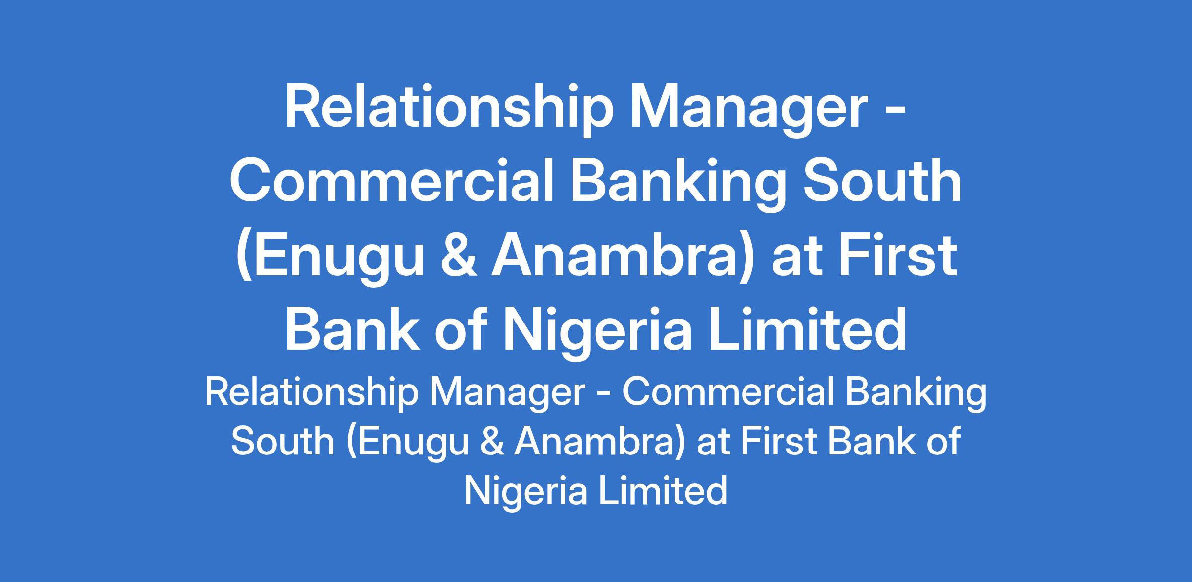 First Bank of Nigeria Limited is recruiting to fill the position of: Relationship Manager - Commercial Banking South. The position is located in Enugu and Onitsha - Anambra States. Interested candidates should possess a First Degree or its equivalent in any discipline preferably business-related with 3 years relevant banking (marketing and credit) experience.