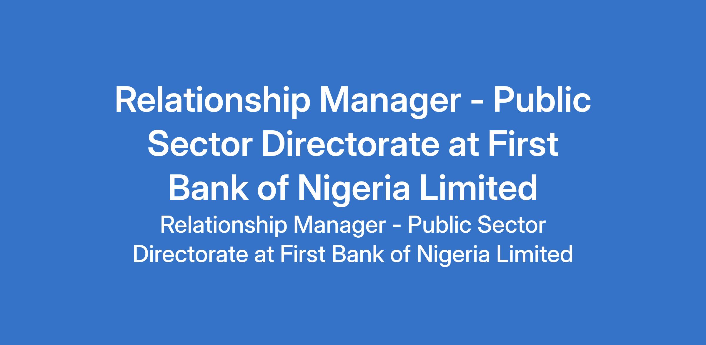 First Bank of Nigeria Limited is recruiting to fill the position of: Relationship Manager - Public Sector Directorate. The position is located in Ekiti States. Interested candidates should possess an HND (minimum of Upper Credit) / B.Sc. (minimum of 2.2) in any discipline with 6 years relevant banking (marketing/business development) experience.