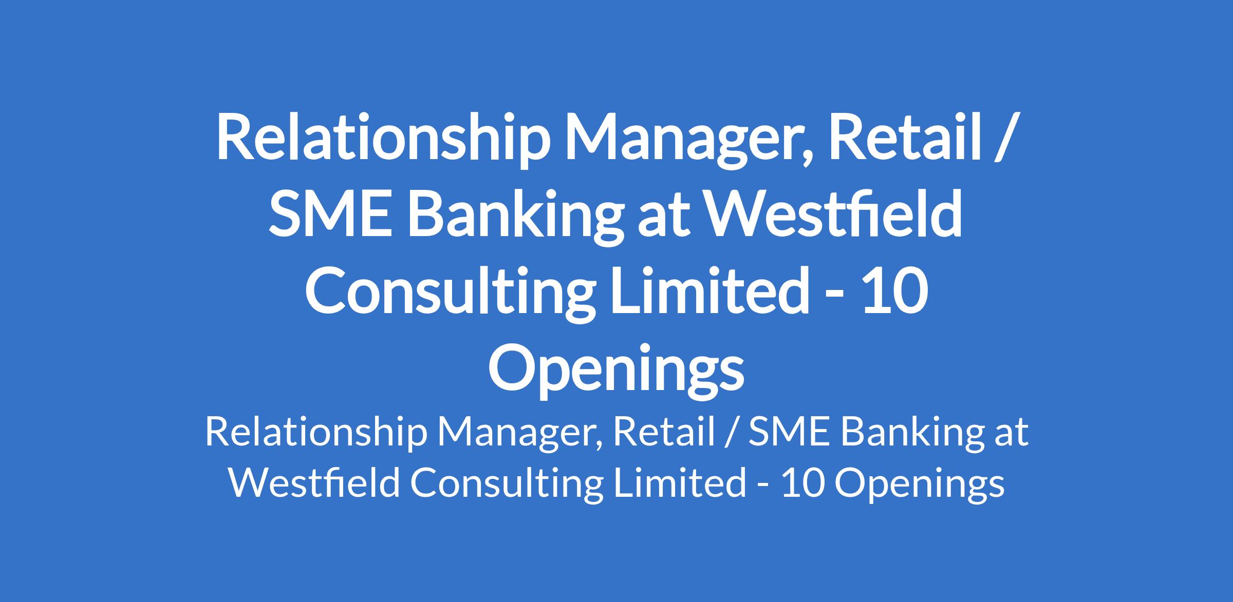 Westfield Consulting Limited - Our client in the Banking sector is recruiting to fill the position of: Relationship Manager, Retail / SME Banking. The position is located in Abuja (FCT), Lagos, Ibadan - Oyo, Calabar - Cross River, Uyo - Akwa Ibom, Benin - Edo, Warri - Delta, Port Harcourt - Rivers, Maiduguri - Borno, and Asese - Ogun States. Interested candidates should possess a Degree in Finance, Accounting, Economics, or related discipline in a recognized institution with 4 7 years continuous banking experience in sales and credit with a minimum of 2 years in a supervisory position for more experienced candidates.