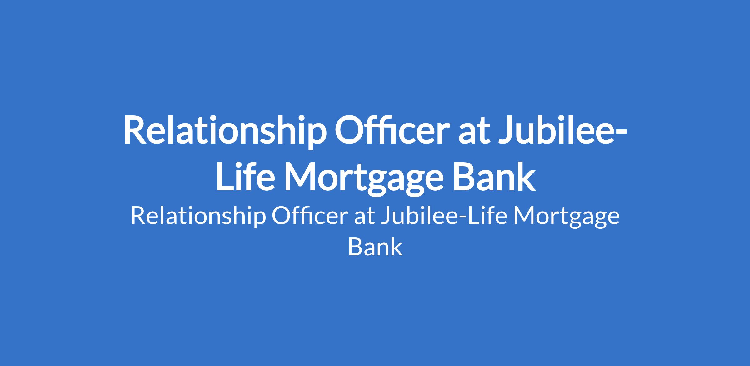 Jubilee-Life Mortgage Bank is recruiting to fill the position of: Relationship Officer. The position is located in Abuja Abuja (FCT). Salary: N384,000 per month. Interested candidates should possess a First Degree from a reputable higher institution with minimum 2 years sales experience in the financial sector.