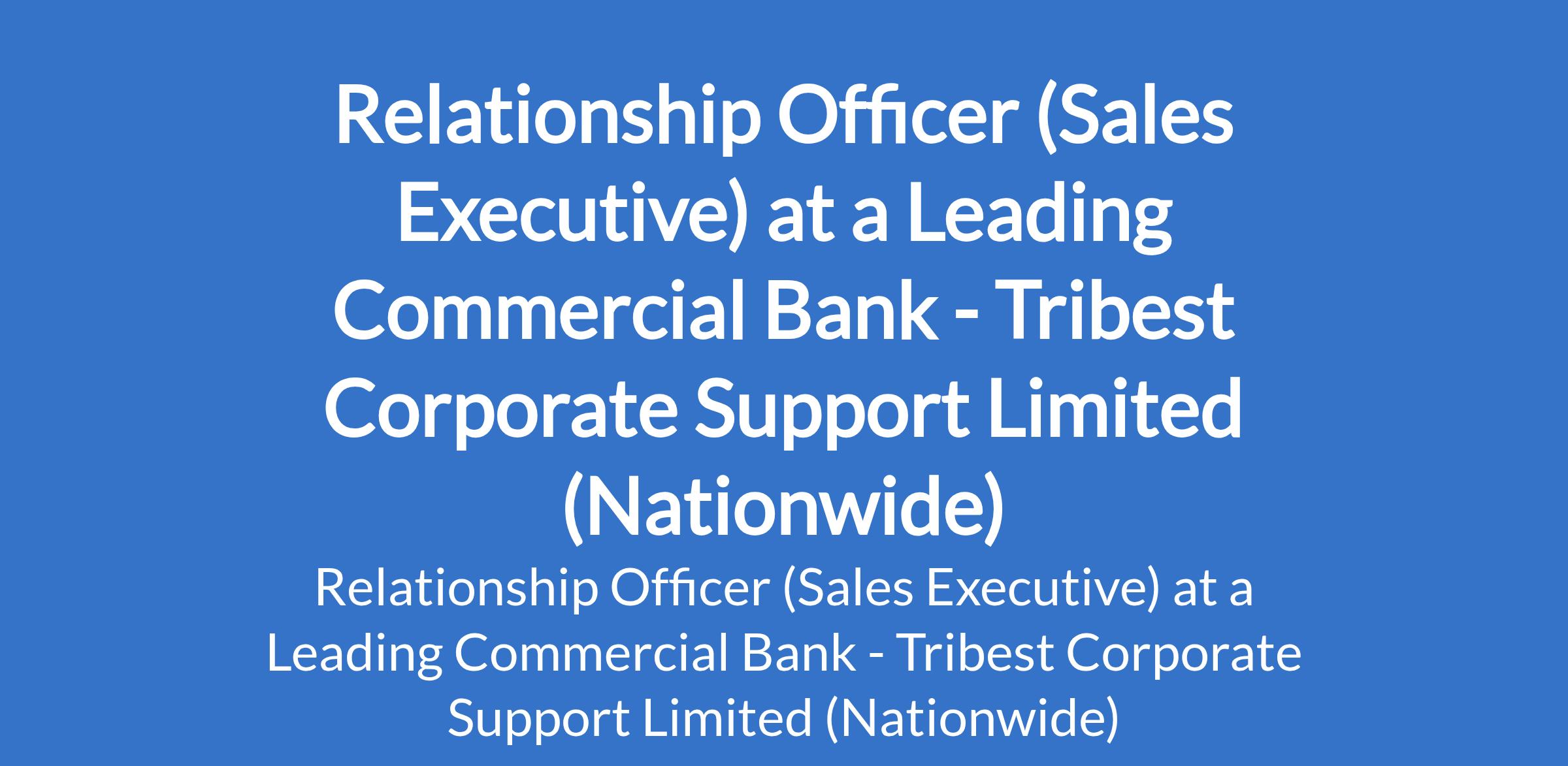 Tribest Corporate Support Limited - Our client, a leading commercial Bank in Nigeria is recruiting to fill the position of: Relationship Officer (Sales Executive). This position is required Nationwide. Salary: N112,000 monthly. Interested candidates should possess an HND or B.Sc Degree with 0-1 year experience.