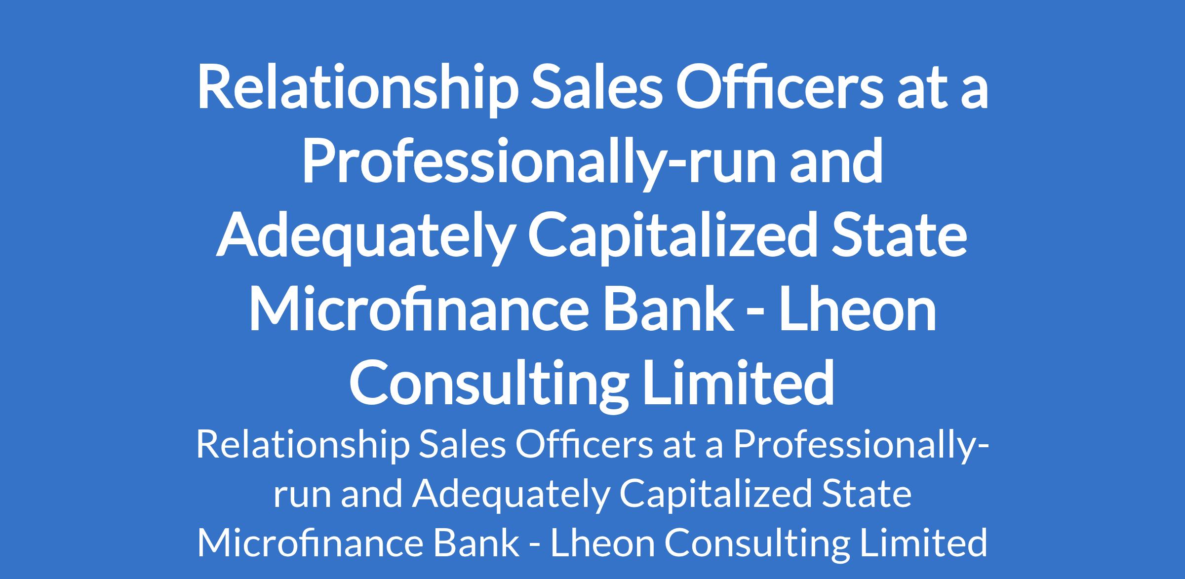 Lheon Consulting Limited - Our client, a professionally run and adequately capitalized state microfinance bank is recruiting to fill the position of: Relationship Sales Officer. The position is located in Lagos State. Salary: N350,000 - N500,000 monthly. Interested candidates should possess relevant qualifications with 2 - 6 years experience.