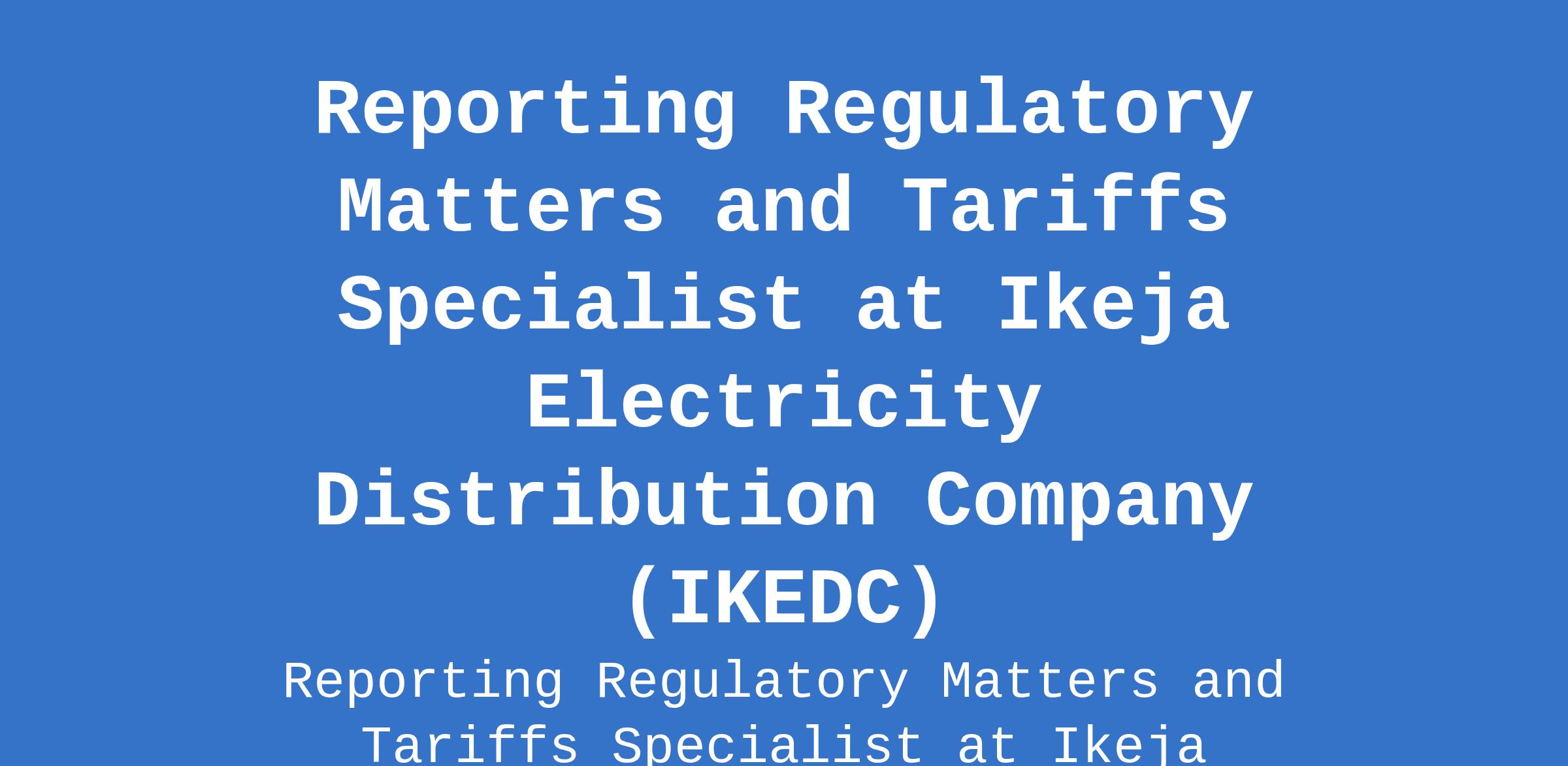 Ikeja Electricity Distribution Company (IKEDC) is recruiting to fill the position of: Reporting Regulatory Matters and Tariffs Specialist. The position is located in Lagos State. As a Reporting Regulatory Matters and Tariffs Specialist, you will play a critical role in driving regulatory compliance and tariff analysis for Ikeja Electric. Interested candidates should possess a Bachelor's Degree or its equivalent in Accounting or Finance and a professional qualification in accounting (ACA/ACCA) with 5 - 7 years of experience in financial reporting, regulatory compliance, and tariff analysis.