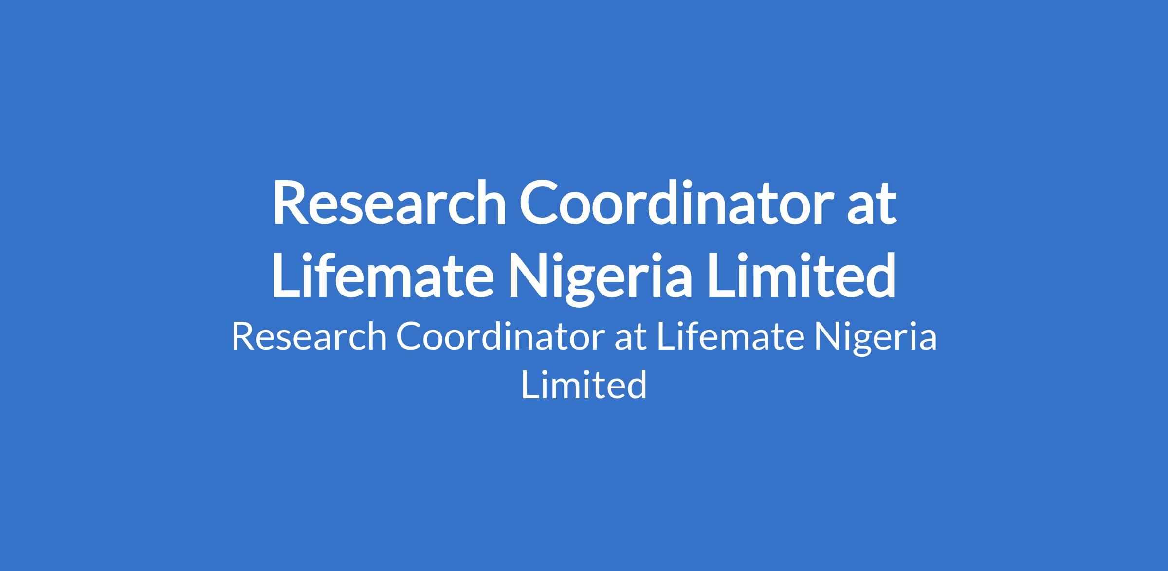 Lifemate Nigeria Limited is recruiting to fill the position of: Research Coordinator. The position is located in Ikeja, Lagos State. Interested candidates should possess relevant qualifications with experience.