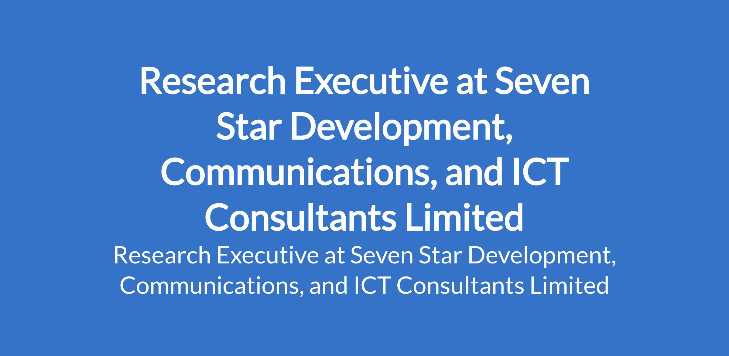 Seven Star Development, Communications, and ICT Consultants Limited is recruiting to fill the position of: Research Executive. The position is located in Abuja (FCT). Interested candidates should possess a Bachelor's degree or higher in social sciences, economics, research and statistics, public policy, development studies, or a related field with at least three years of experience in conducting and managing research projects in a development context.