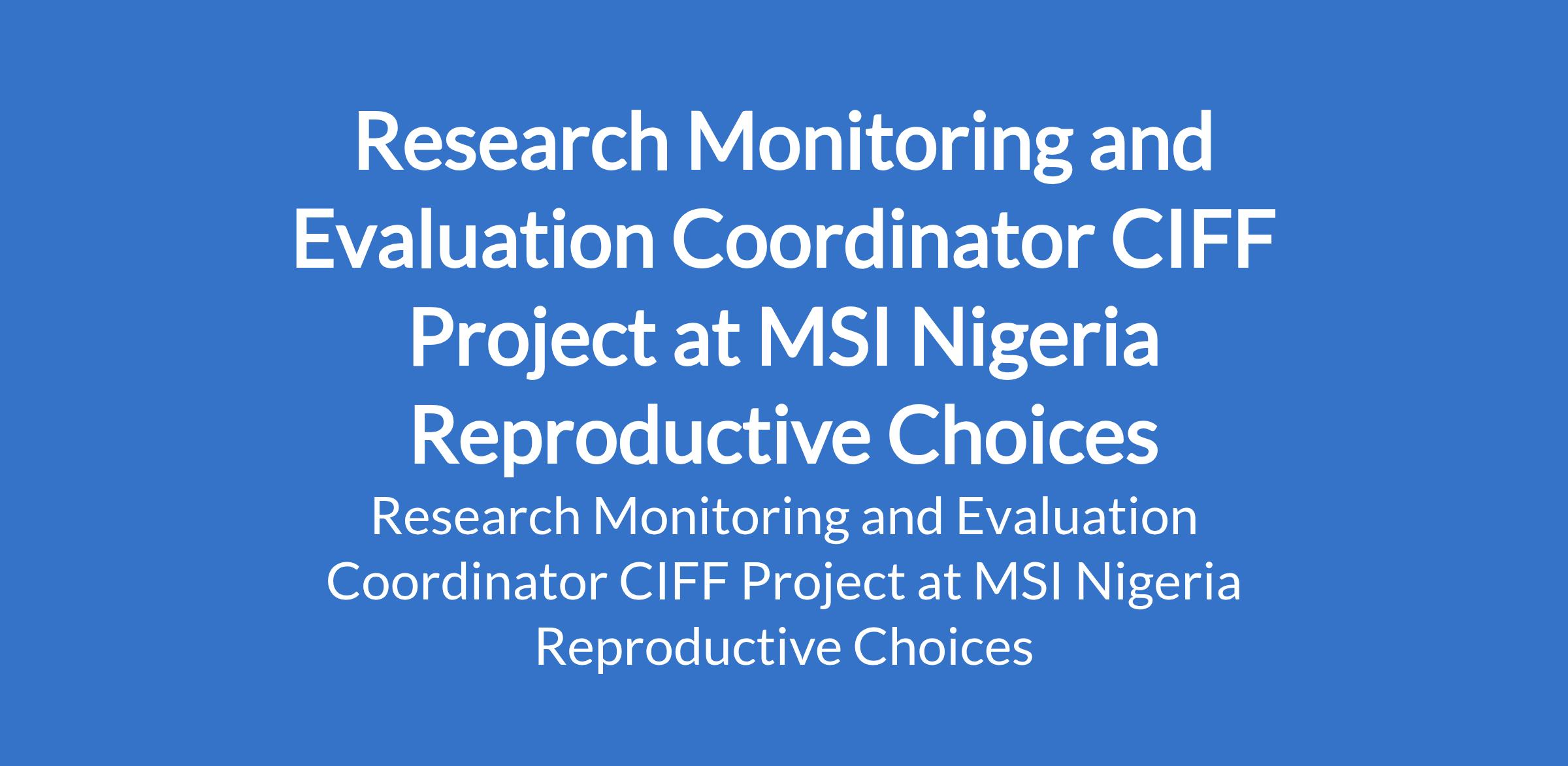 MSI Nigeria Reproductive Choices is recruiting to fill the position of: Research Monitoring and Evaluation Coordinator CIFF Project. The position is located in Abuja (FCT). Interested candidates should possess a Bachelors Degree in public health, Demography, Statistics, Economics, Social Sciences, Monitoring and Evaluation, or a related field; a Masters Degree in Public Health (MPH), Monitoring and Evaluation, Biostatistics, Development Studies, or a related discipline is an added advantage with 5 7 years of progressively responsible experience in Monitoring and Evaluation, preferably in SRH/Family Planning or health programming.