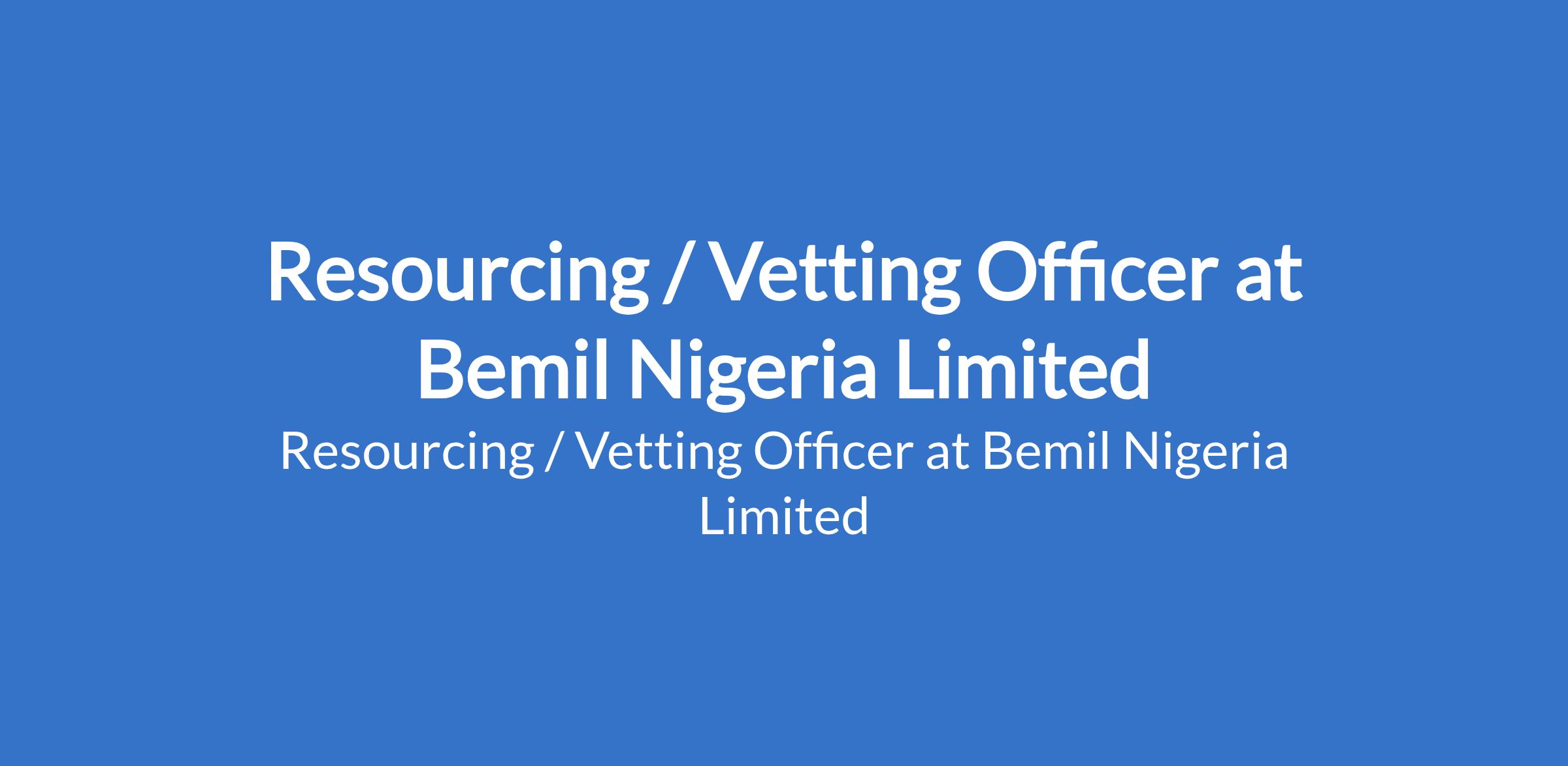 Bemil Nigeria Limited is recruiting to fill the position of: Resourcing / Vetting Officer. The position is located in Port Harcourt, Rivers State. Salary: N200,000 - N250,000 per month. Interested candidates should possess a minimum of OND with Work experience in a security company is an added advantage.