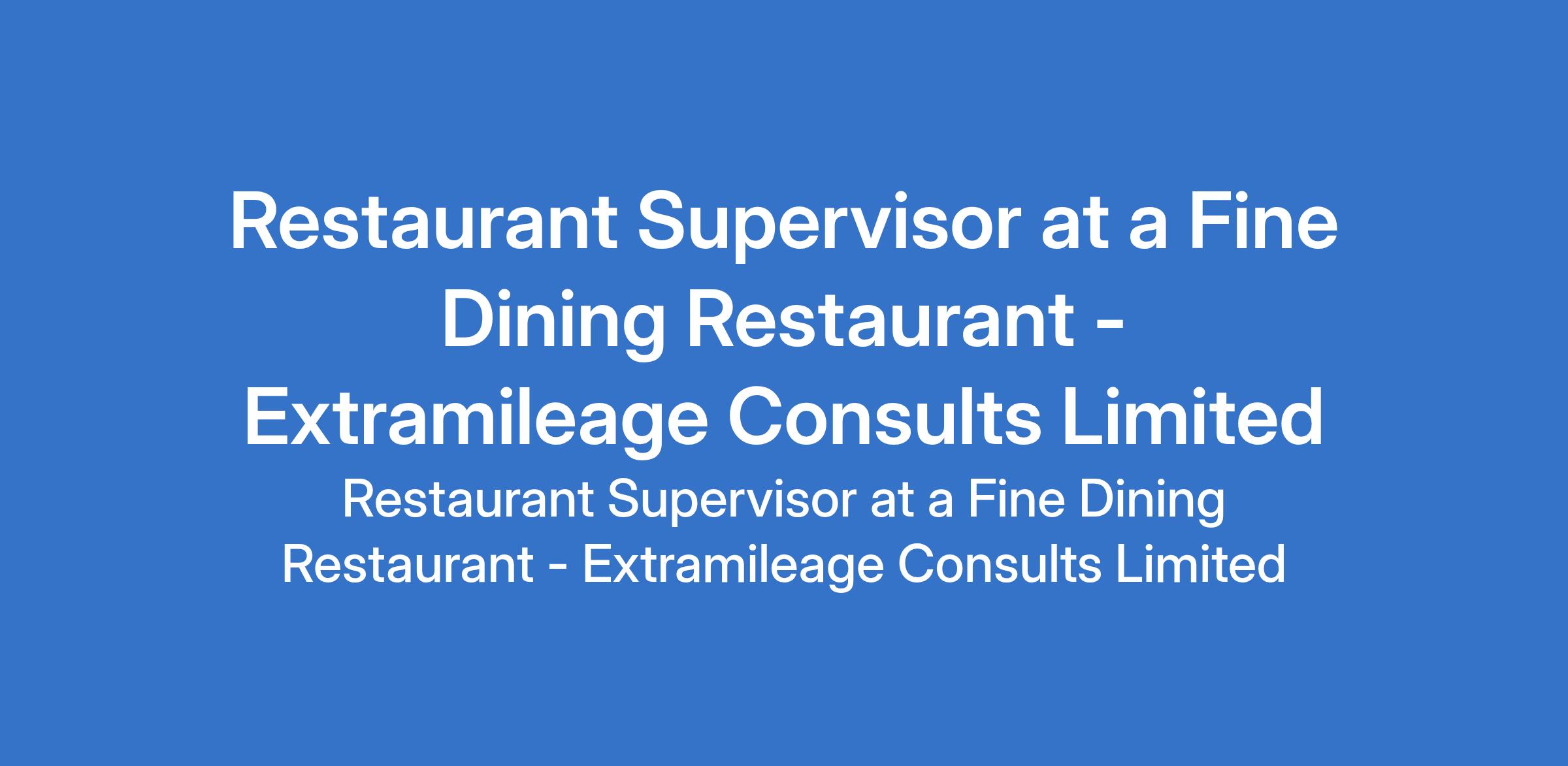 Extramileage Consults Limited - Our client, a Fine Dining Restaurant is recruiting to fill the position of: Restaurant Supervisor. The position is located in Lekki Phase 1, Lagos State. Salary: N120,000 - N150,000 monthly. Interested candidates should possess a relevant qualification with a minimum of 3 years experience in similar role.