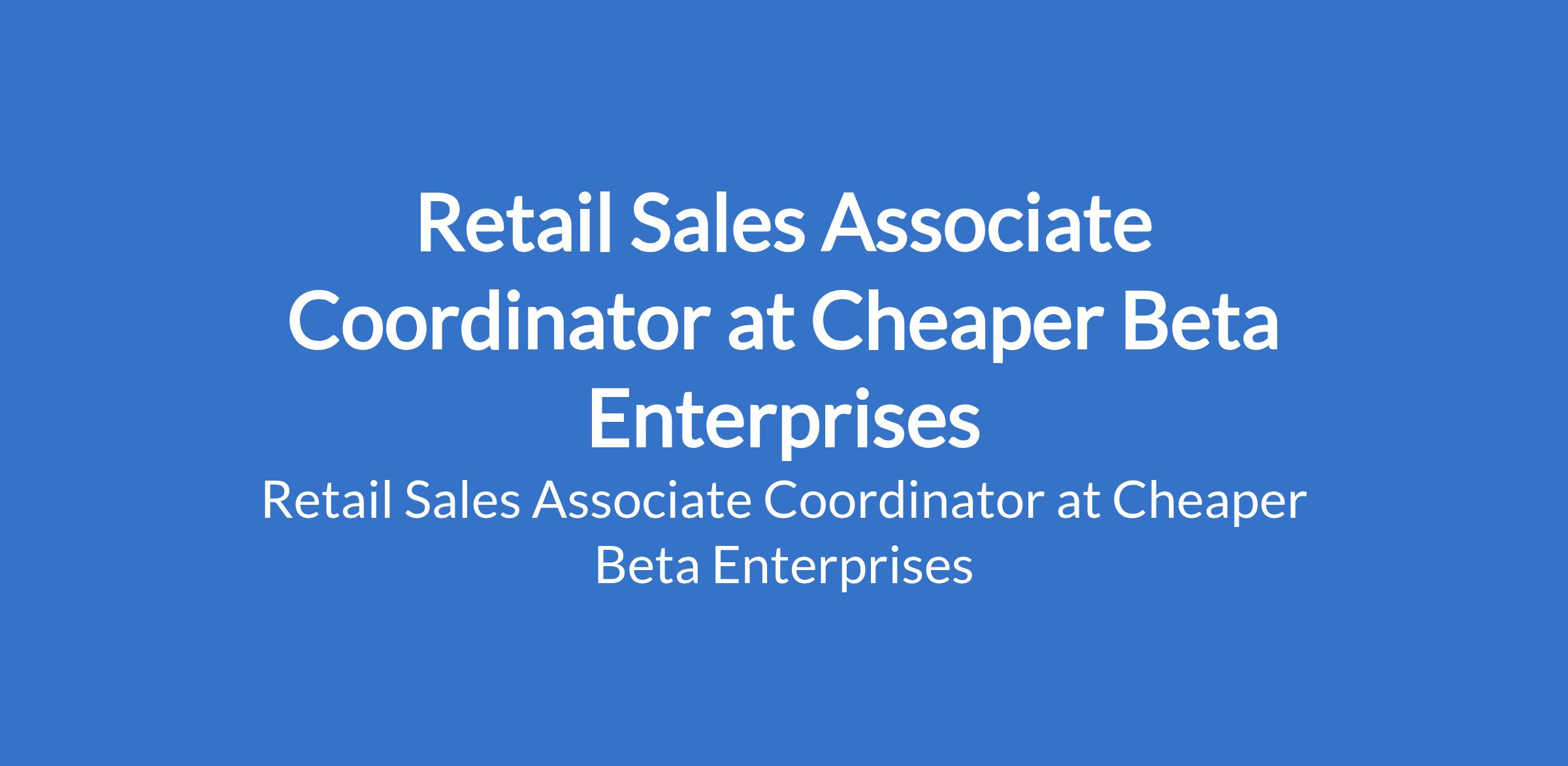 Cheaper Beta Enterprises is recruiting to fill the position of: Retail Sales Associate Coordinator. The position is located in Lagos State. Salary: N150,000 - N170,000 / month. Interested candidates should possess a Bachelors Degree or equivalent in Sales, Marketing, Business Administration, or a related field with 2 5 years of experience in sales, Administration, Project Management (FMCG experience is an advantage).