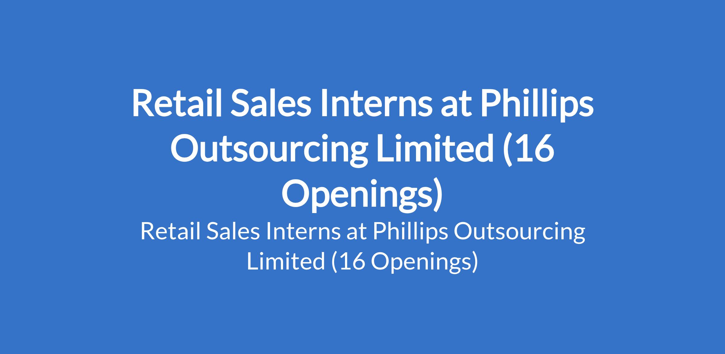 Phillips Outsourcing Limited is recruiting to fill the position of: Retail Sales Intern. The position is located in Ikoyi, Awolowo, Marina, Idumota, Onikan, VI Ahmadu BelloWay, VI Tiamiyu Savage, Akoka St.Finbarrs, Lekki Expressway, Ajah Lekki, Ikota, Epe Aiyetoro, VI Adeola Hopewell, VI Adeola Odeku, VI Ajose Adeogun, and VI Crescent - Lagos State. Salary: N155,000 monthly. Interested candidates should possess relevant qualifications with a minimum of 1 year experience as a sales person, and must reside within the location specified and its environs.