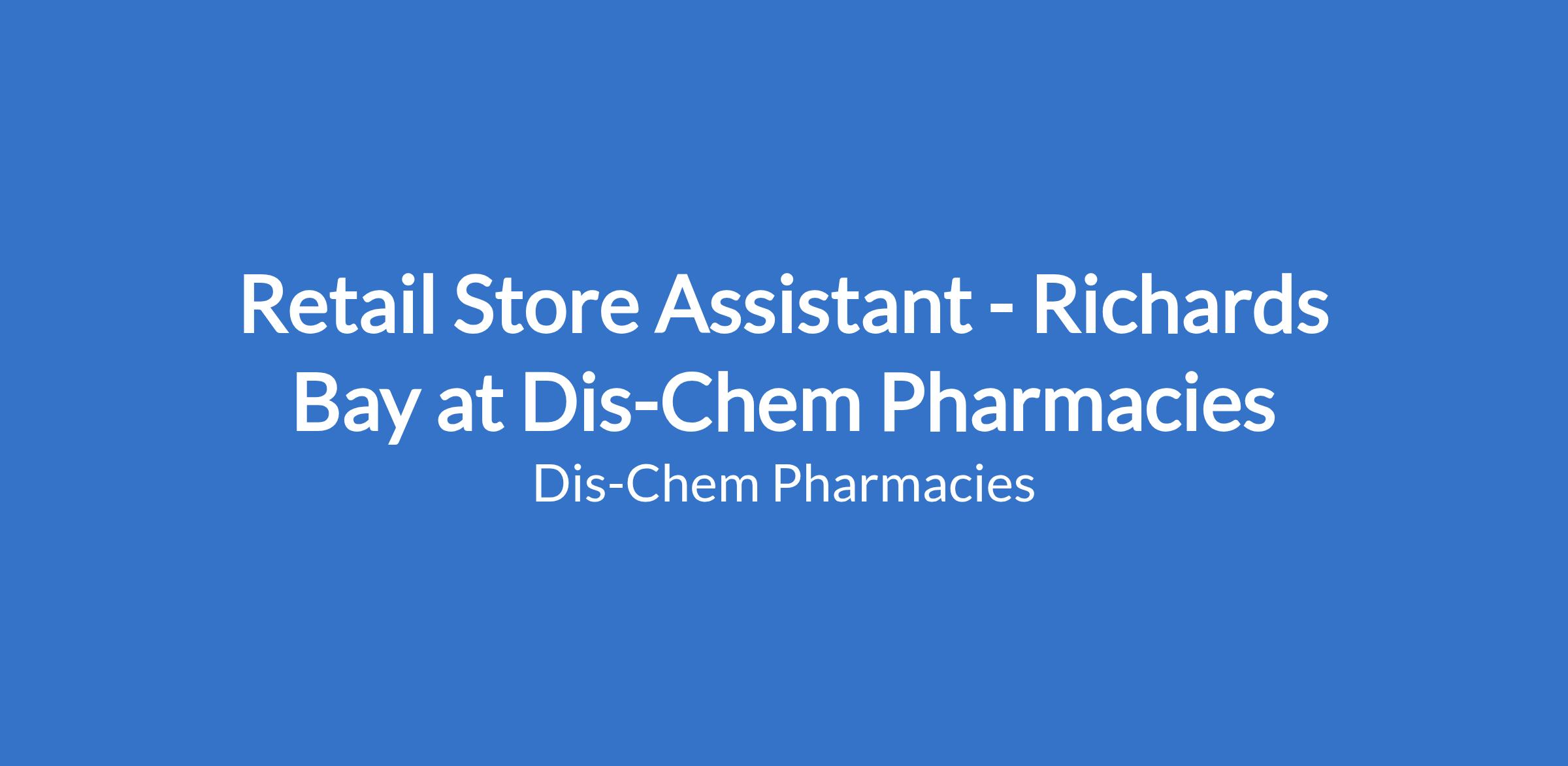 Dis-Chem Pharmacies' Richards Bay store has an opportunity available for a Retail Store Assistant to join the team. The main purpose of this role will be assist with the overall management of the store to ensure, operational and administrative duties are performed as per the standard policy and procedure.