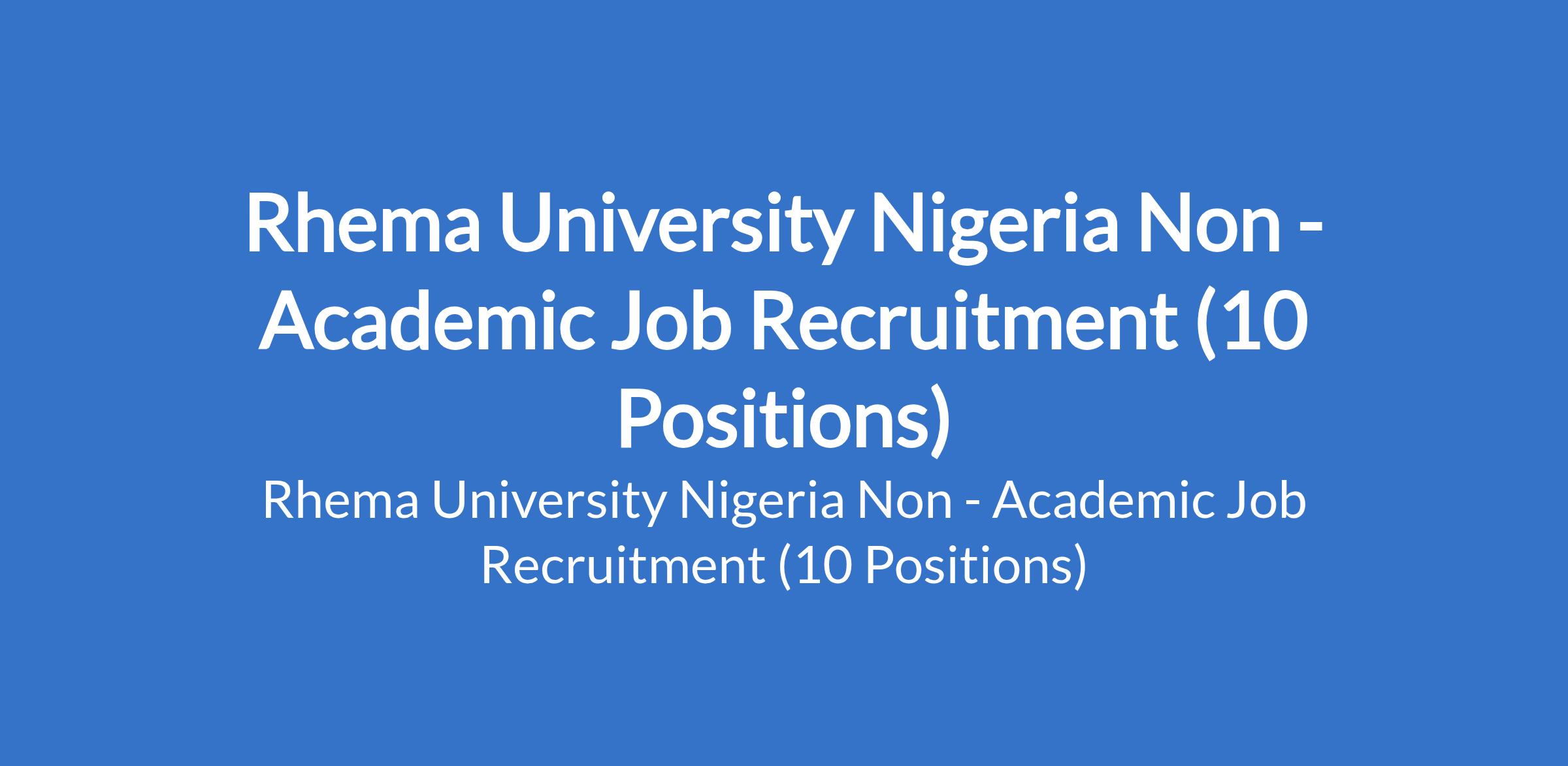 Rhema University Nigeria invites applications from suitably qualified candidates to fill the following Non - Academic positions in Abia State: Substantive University Librarian, Substantive Bursar, Senior Assistant Registrar, Assistant Registrar, Chief Accountant, Principal Accountant, Senior Accountant, Technologist (Physics), and Secretary.