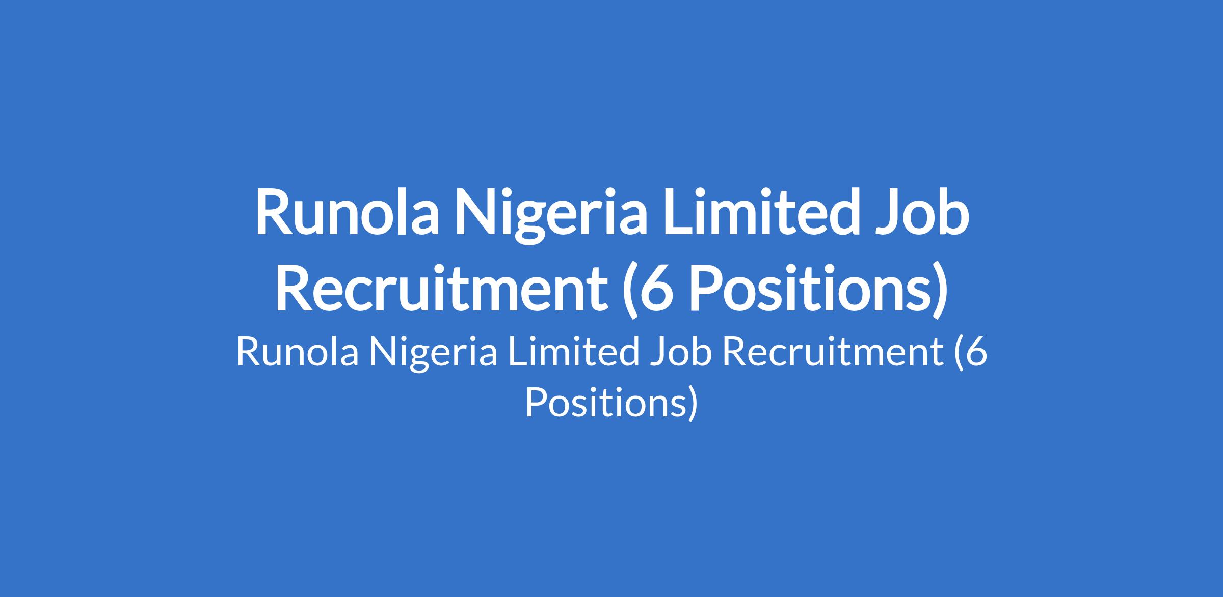 Runola Nigeria Limited is recruiting suitably qualified candidates to fill the following positions in Delta and Lagos States: Sales Executive, Telesales Officer, Monolayer - Packing Bag Machine Operator, Driver, Storekeeper, and Sales Administrative Officer.