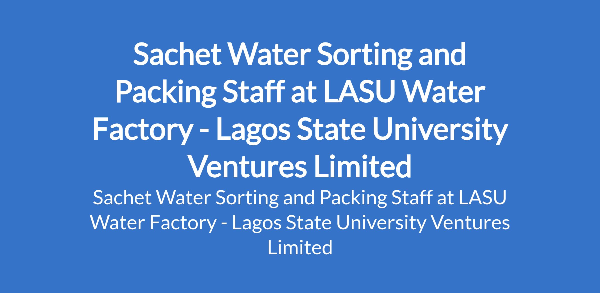 LASU Water Factory under the Lagos State University Ventures Limited invites applications from suitable candidates to fill the position of: Sachet Water Sorting and Packing Staff. The position is located in Ojo, Lagos State. Interested candidates should possess a minimum of SSCE/NECO certificate.