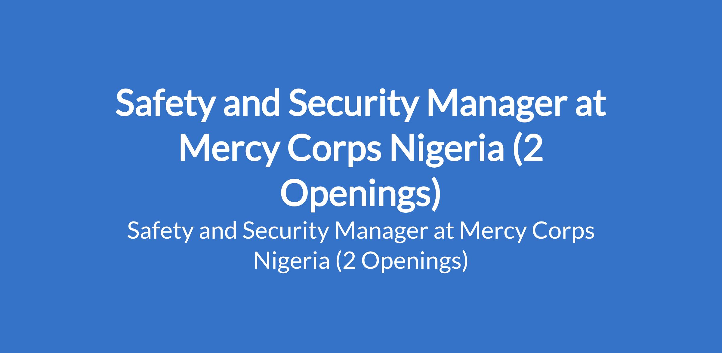 Mercy Corps Nigeria is recruiting to fill the position of: Safety and Security Manager. The position is located in Borno, and Yobe States. Interested candidates should possess a Bachelors Degree in relevant discipline with 3-5 years field experience in safety and security with a humanitarian or development non-governmental organization.
